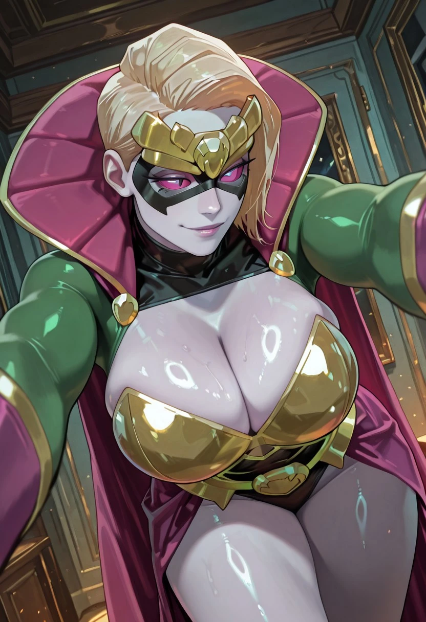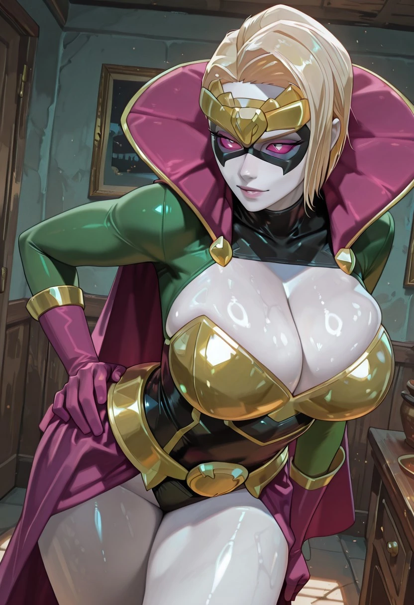 QUINLEZ , 1girl ,blonde , asymmetrical hair , short hair , black mask ,cleavage cutout , wide belt , superhero , purple gloves , domino mask , purple sclera , slit eyes , gold tiara , gold-chest-plate , gold belt , multicolor leotard , high-neck leotard , black leotard , green leotard , green sleeves , yellow leotard , purple ruff , purple waist cape , purple cape , pale-white-skin