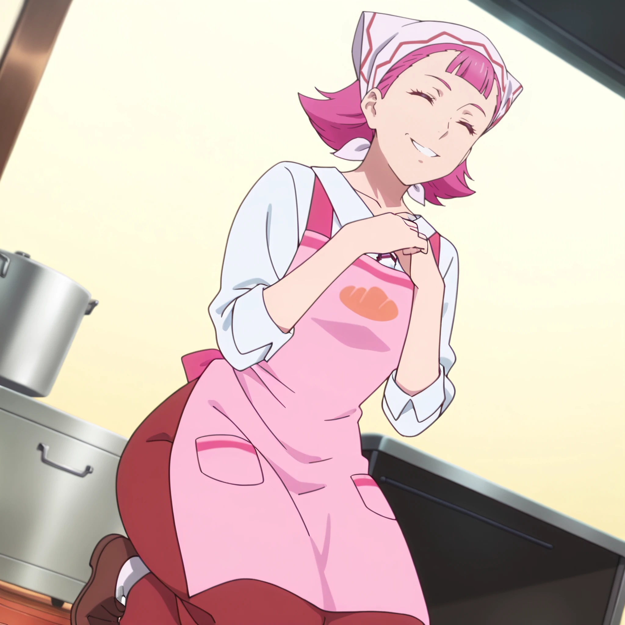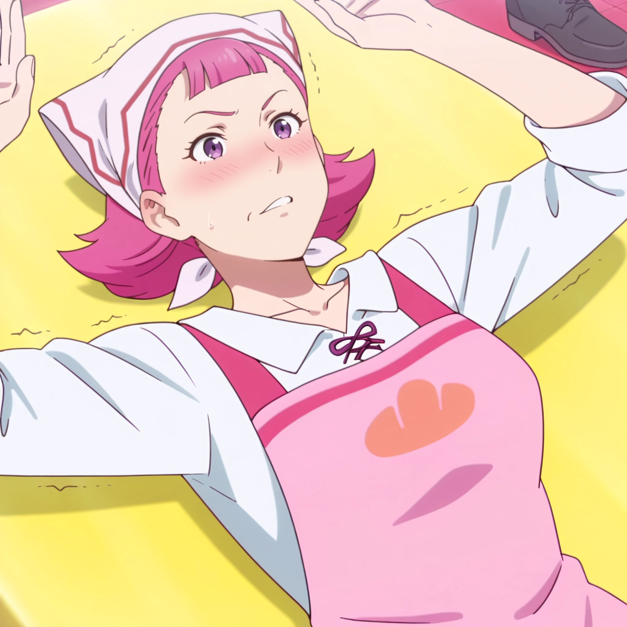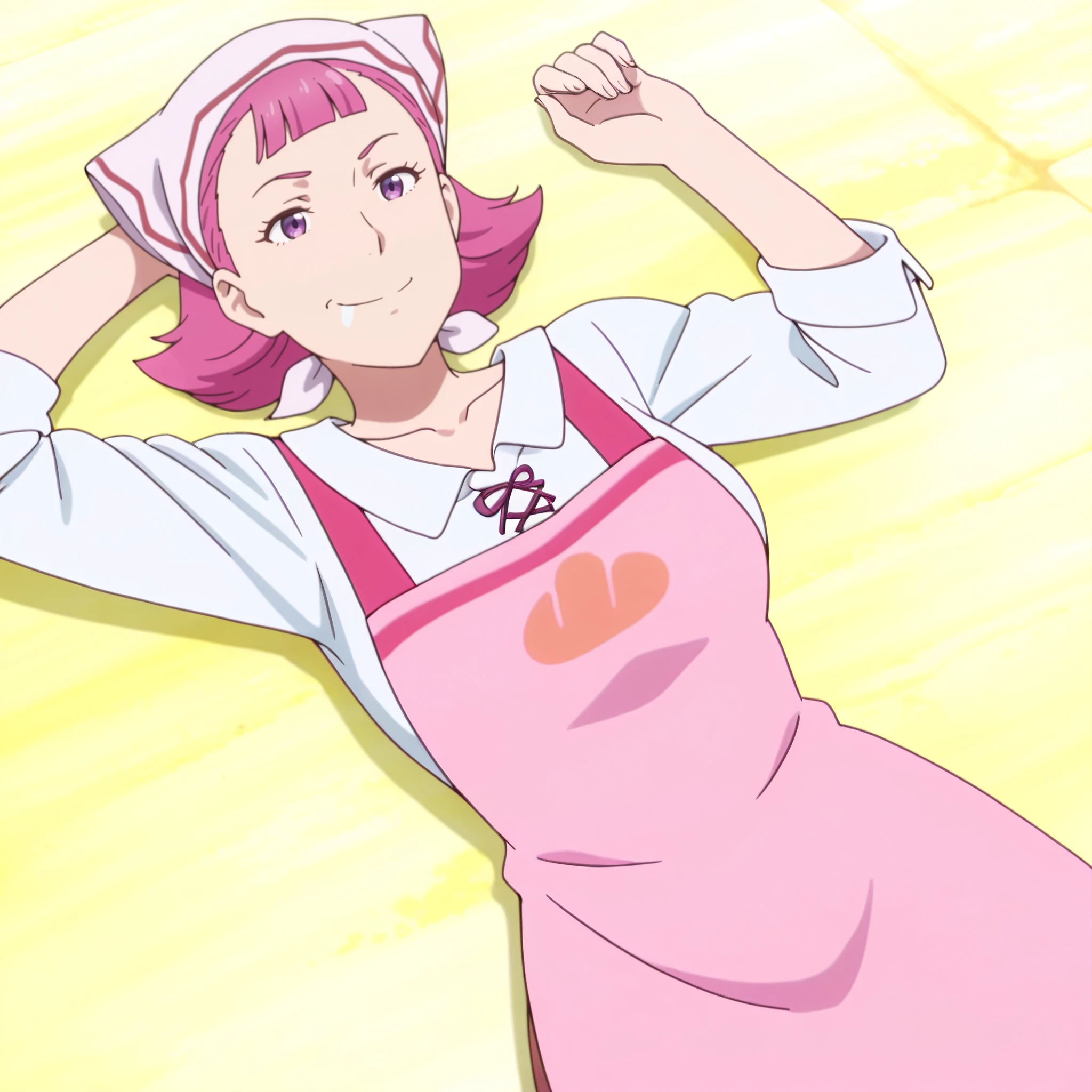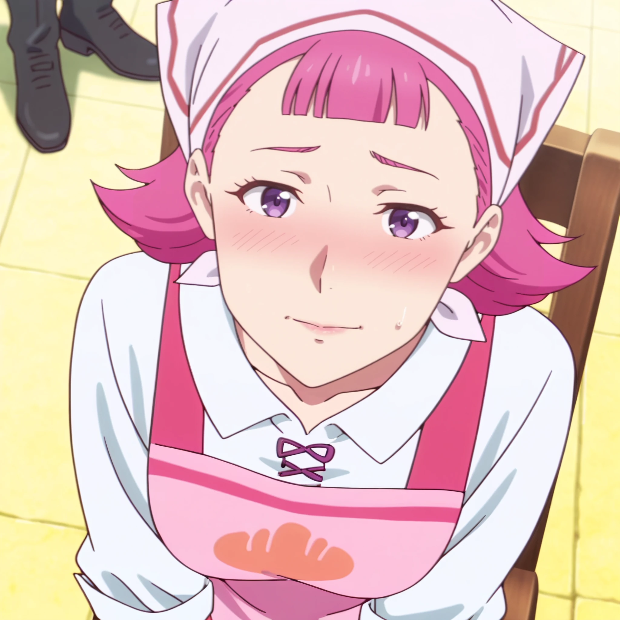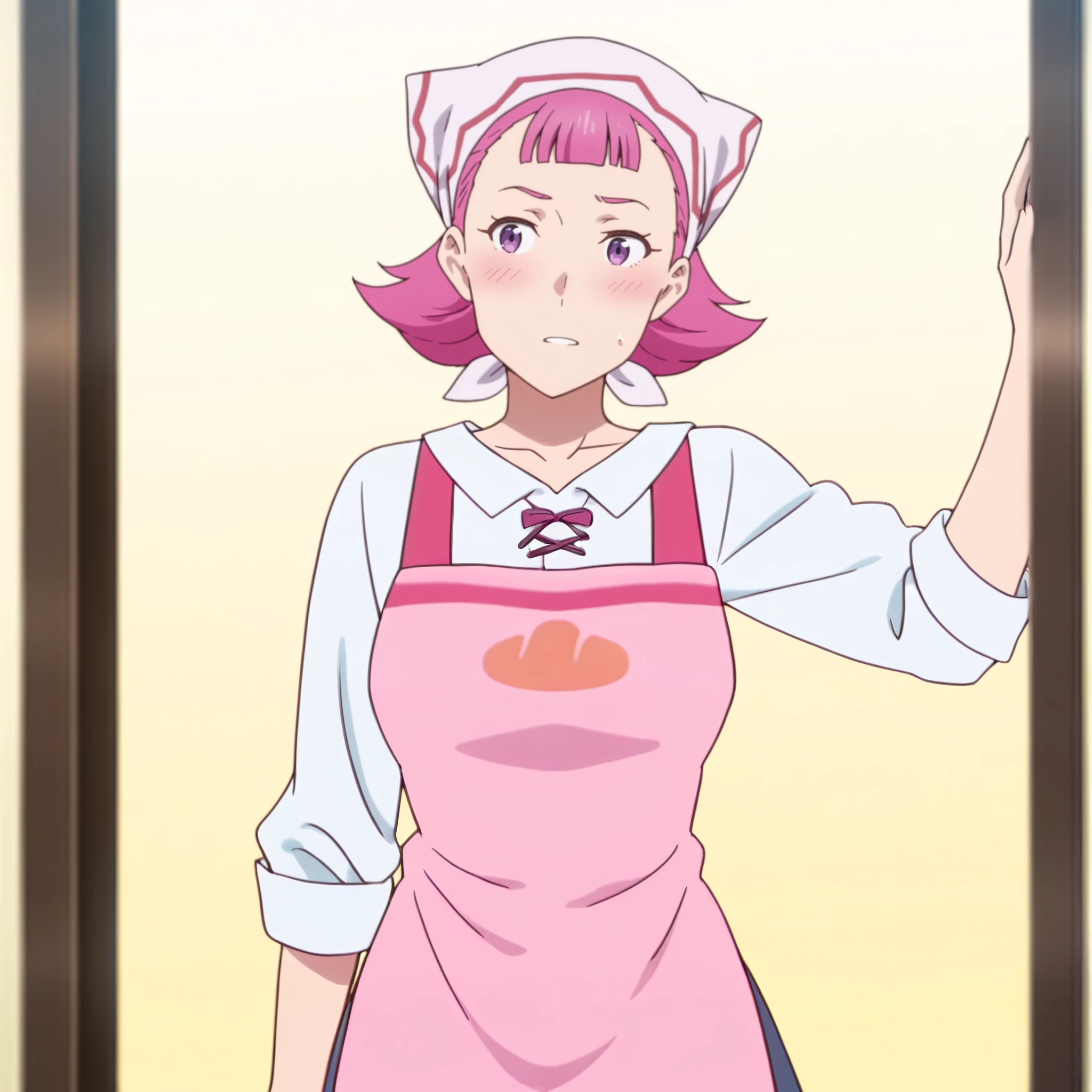shirt, apron, head scarf, pink apron, collarbone, white shirt, sleeves rolled up, ribbon, short sleeves, collared shirt, bow, pink bow,