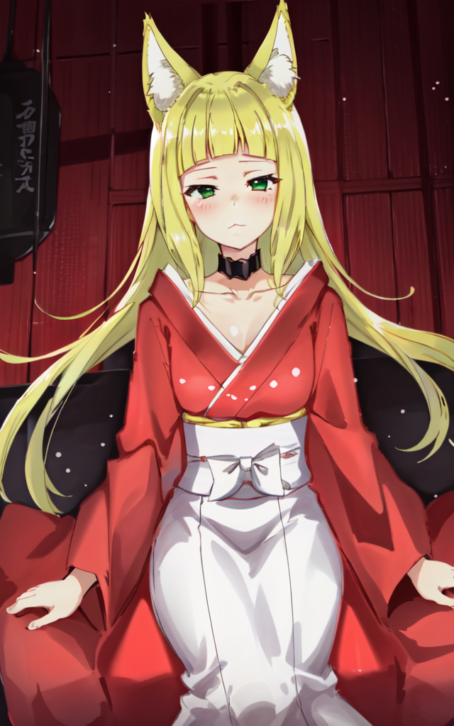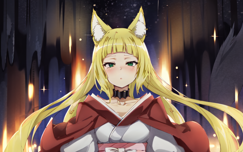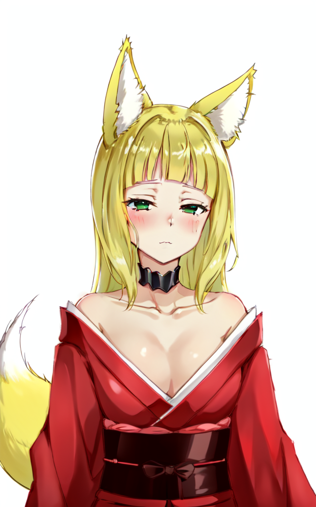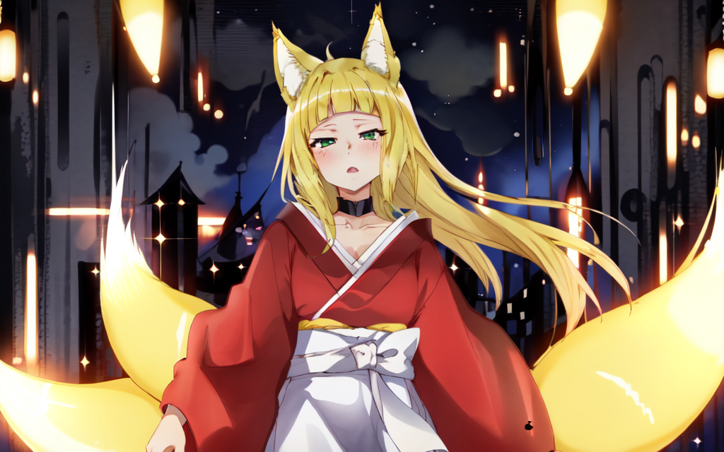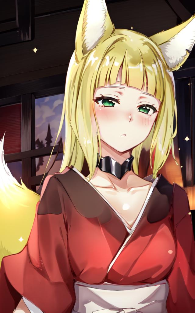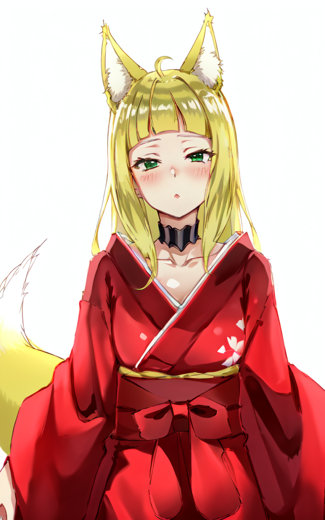 haruhime <lora:haruhime:0.8> 1girl, blond hair fox_ears huge fox tail long hair blunt_bangs shiny hair, green_eyes sleepy eyes, eyeliner blush medium breasts skindantation choker :> red kimono, japanese_clothes, half white hakama, capelet uchidenokoduchi shine tails , face to tiptoe