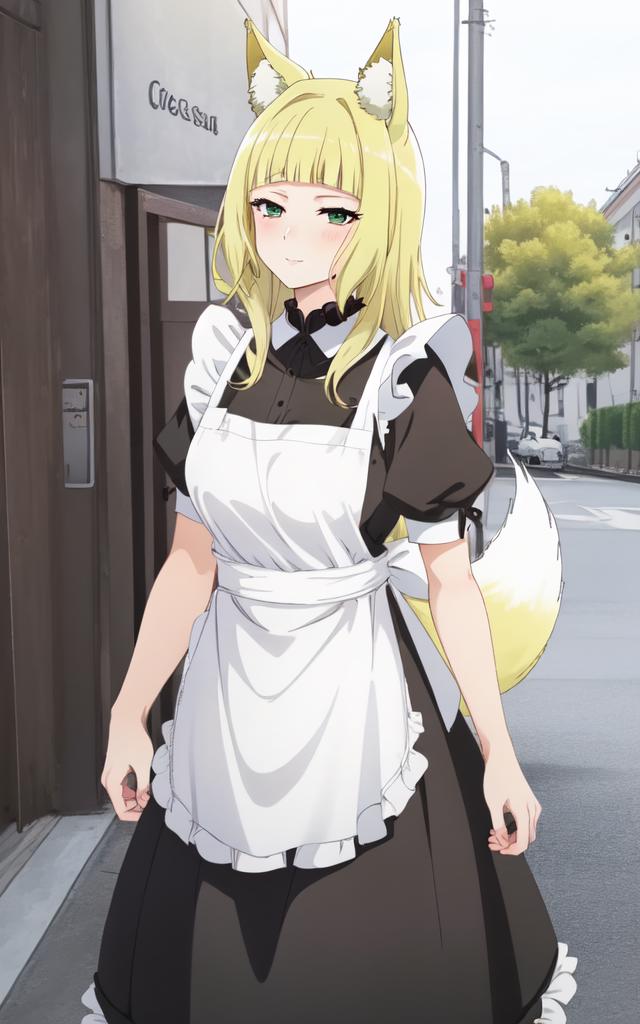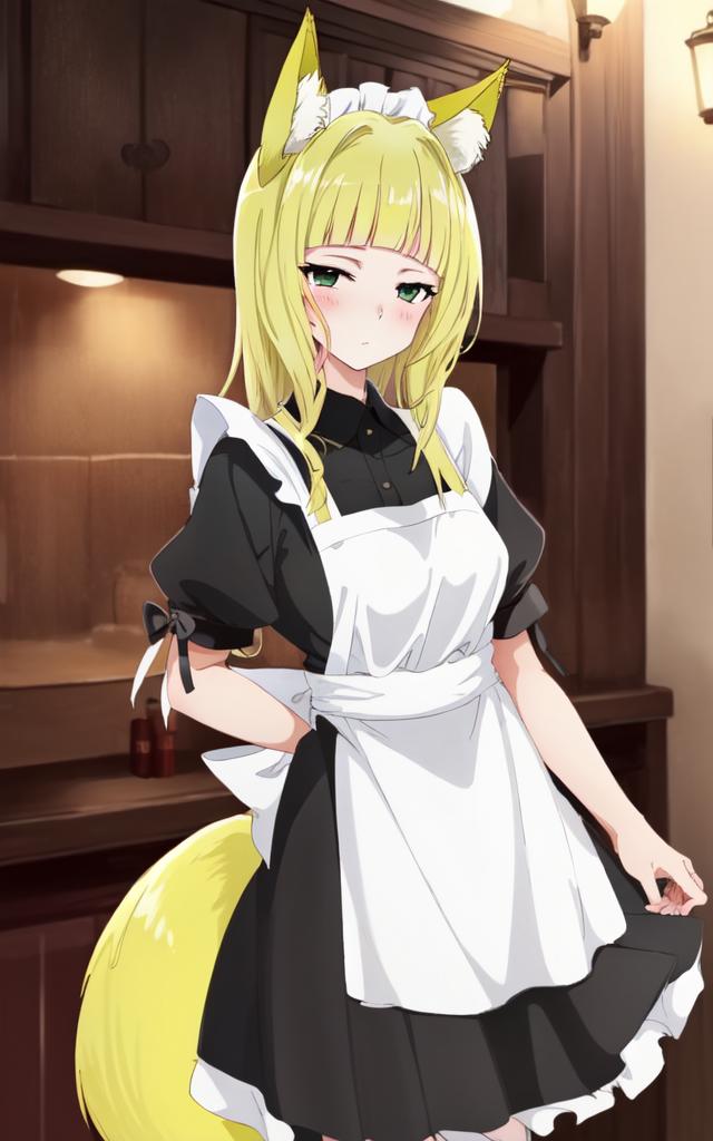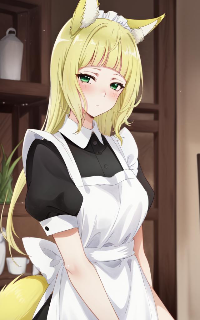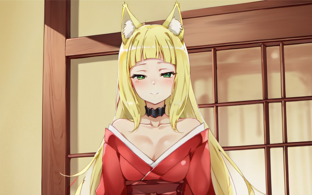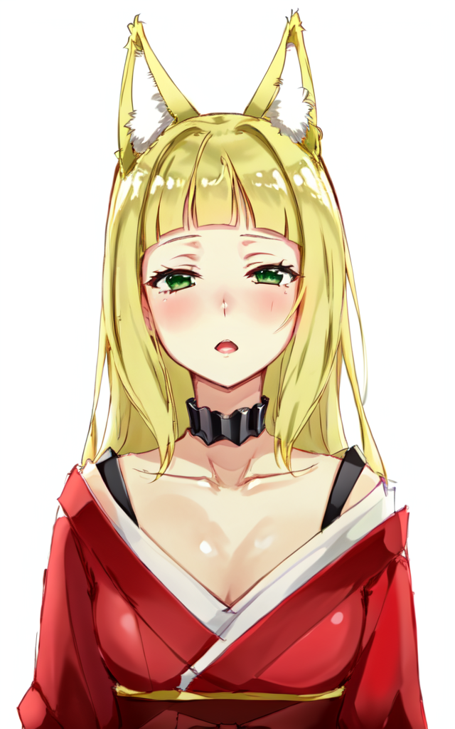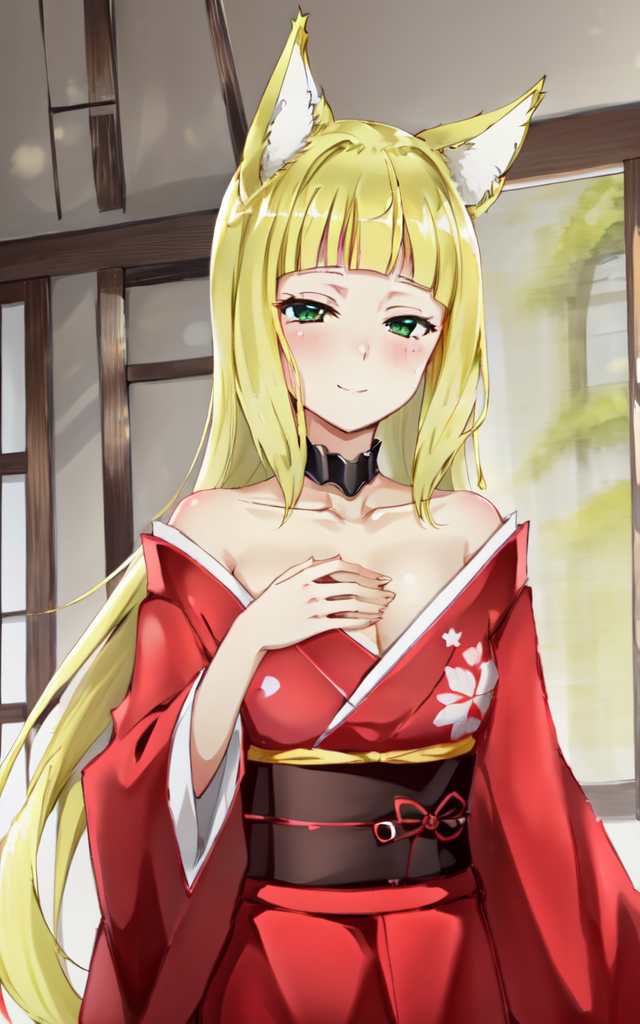 haruhime <lora:haruhime:0.8> 1girl, blond hair fox_ears huge fox tail long hair blunt_bangs shiny hair, green_eyes sleepy eyes, eyeliner blush medium breasts skindantation choker :> red kimono, japanese_clothes, half white hakama, capelet uchidenokoduchi shine tails , face to tiptoe