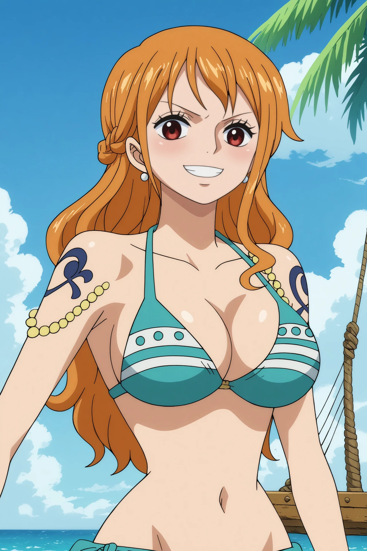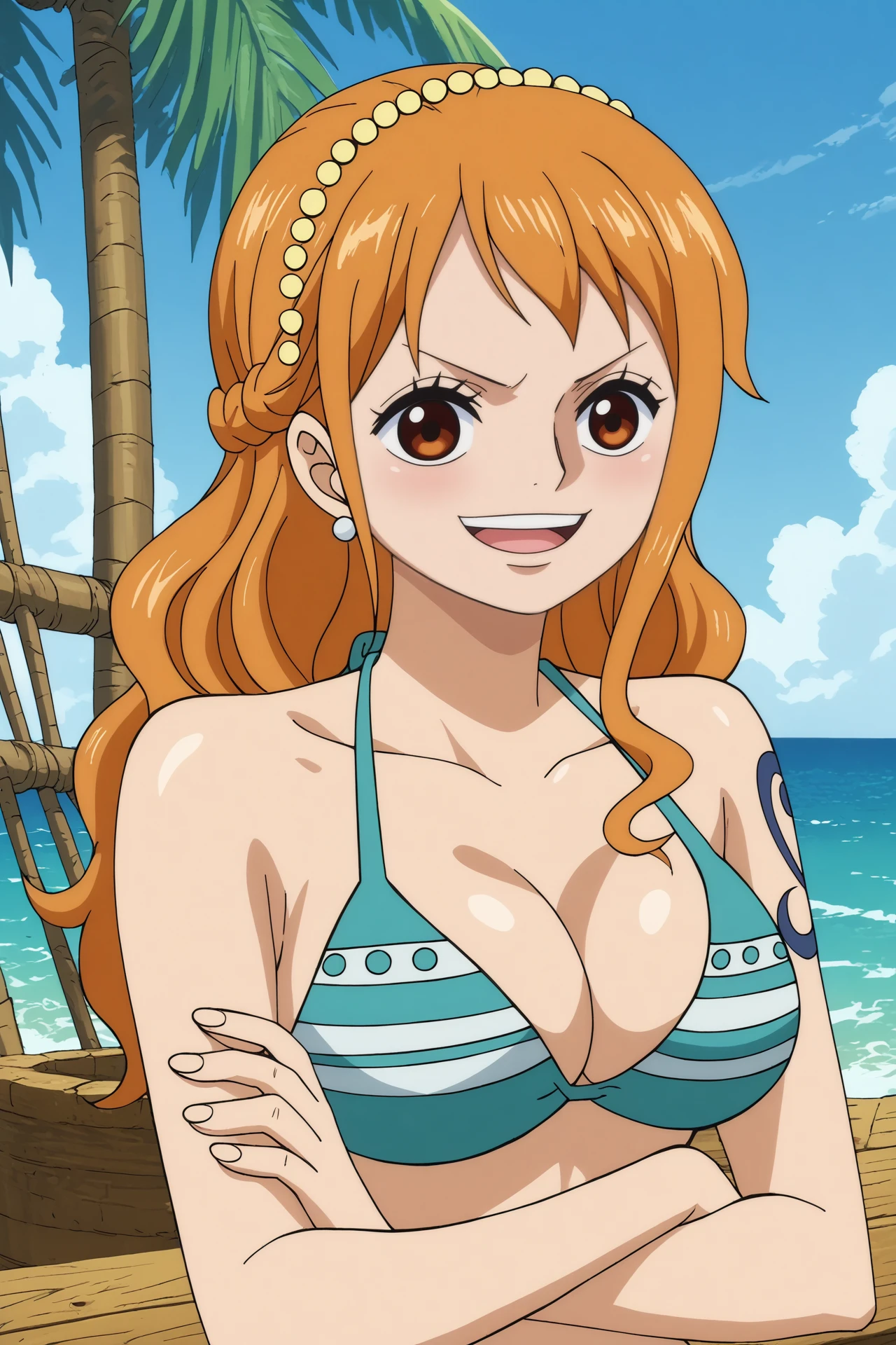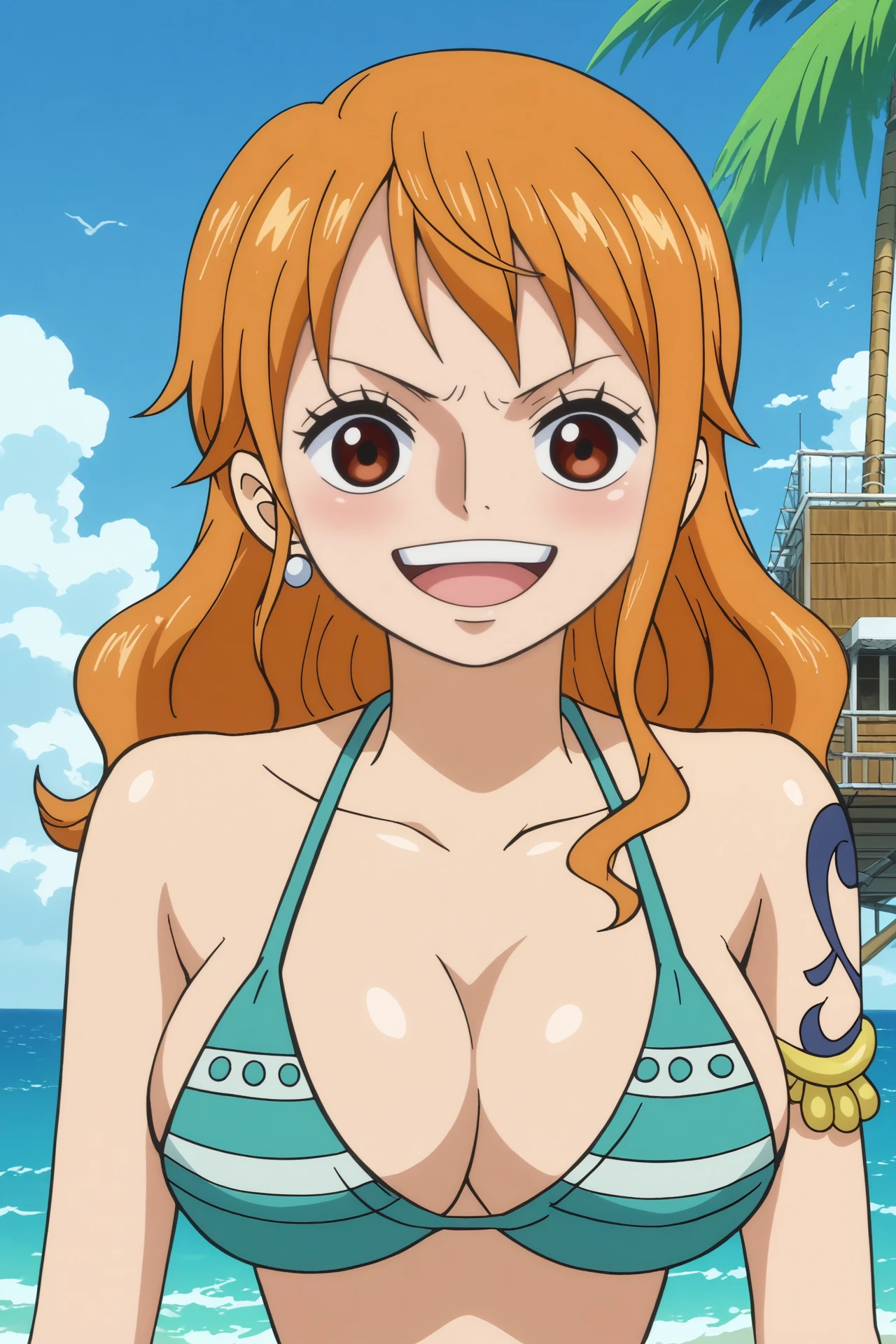 Triggers : nami,1girl,solo,mature,tattoo,orange hair,black eyes,shirt,breasts,large breasts,striped shirt,short sleeves,miniskirt,collarbone,looking_at_viewer