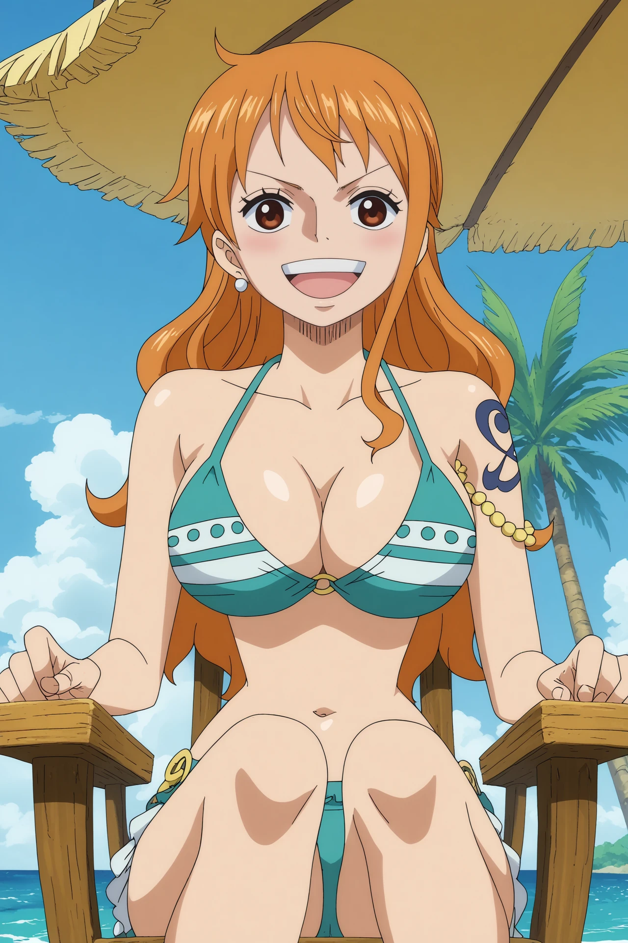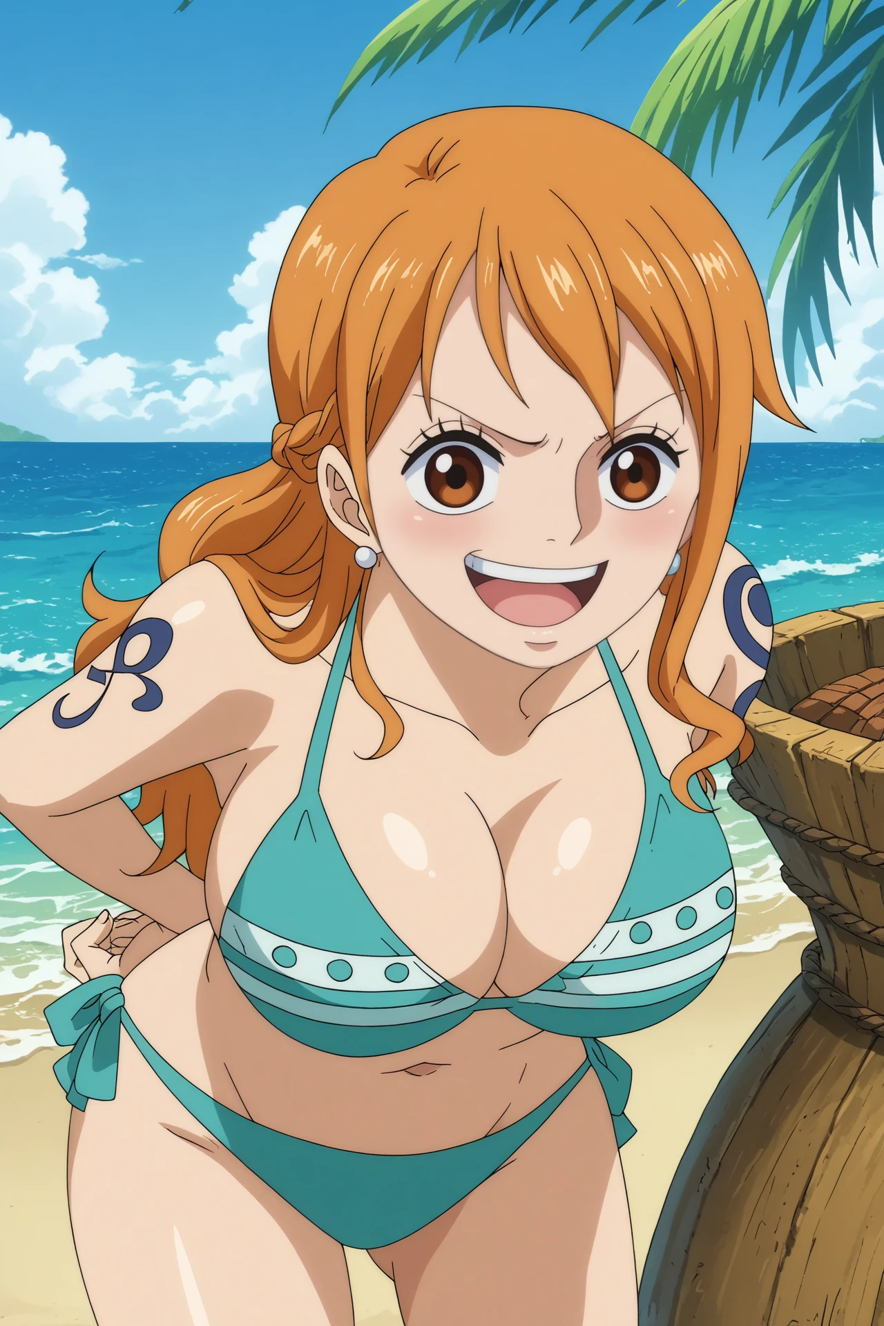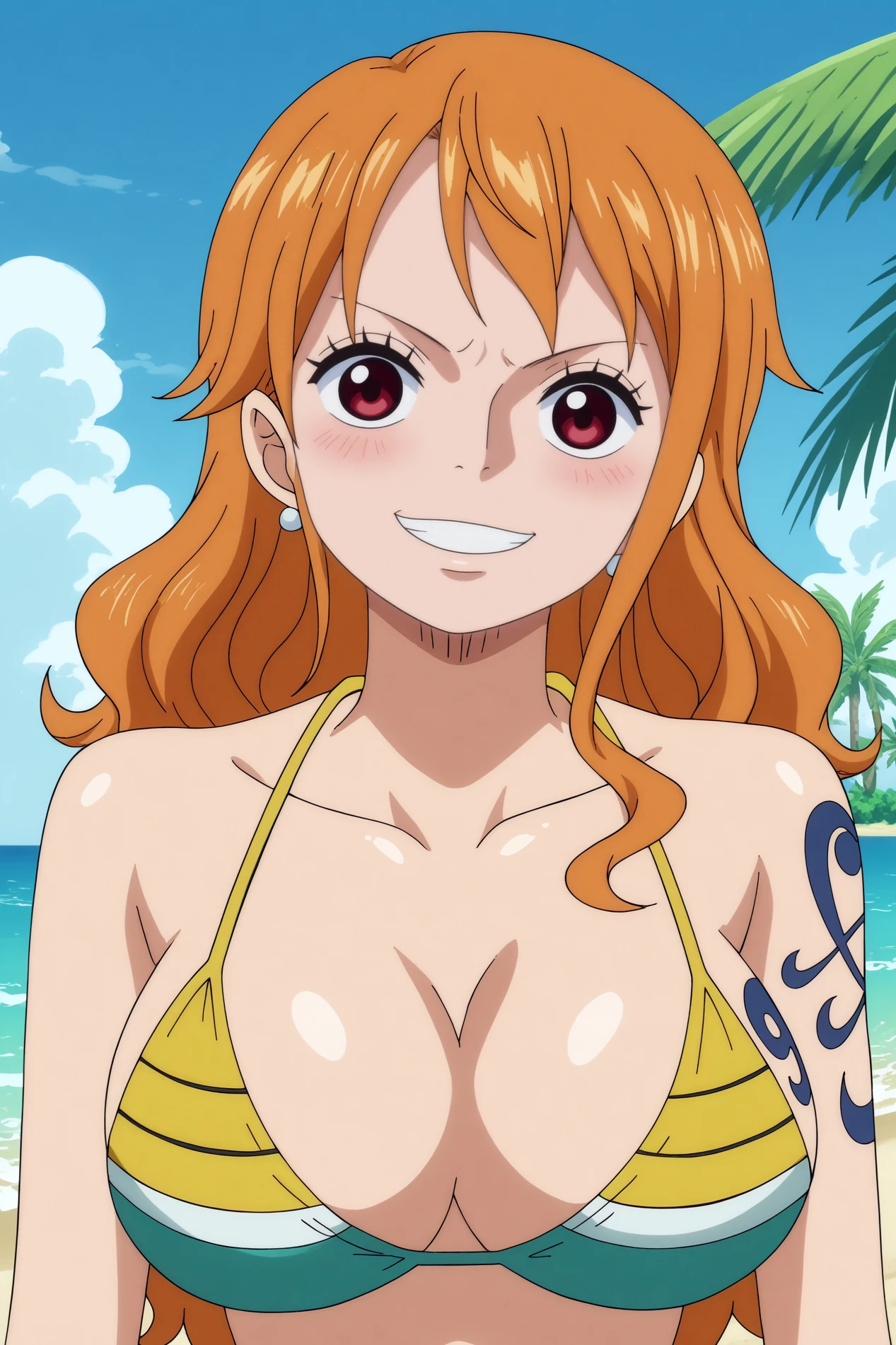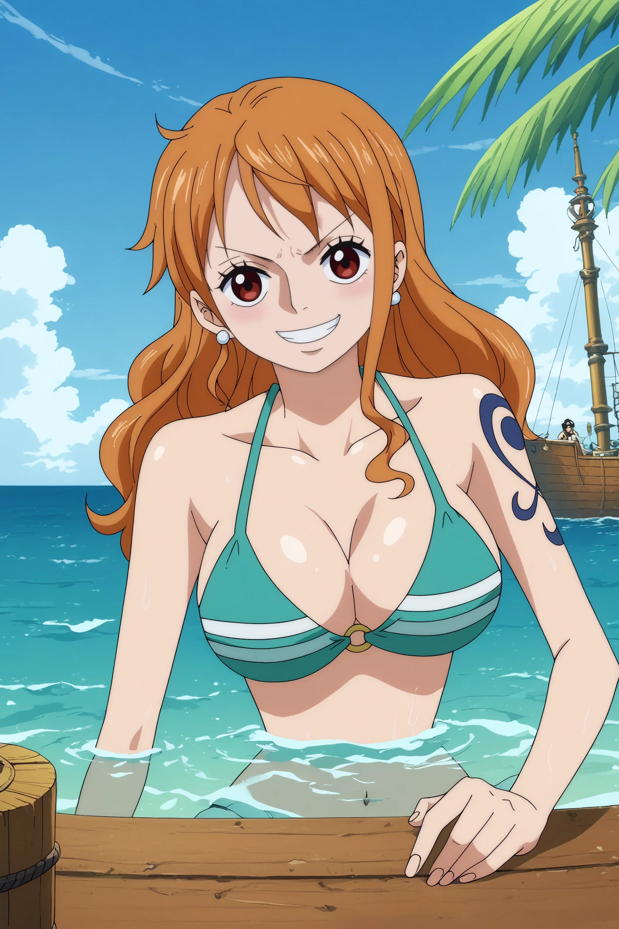 Triggers : nami,1girl,solo,mature,tattoo,orange hair,black eyes,shirt,breasts,large breasts,striped shirt,short sleeves,miniskirt,collarbone,looking_at_viewer