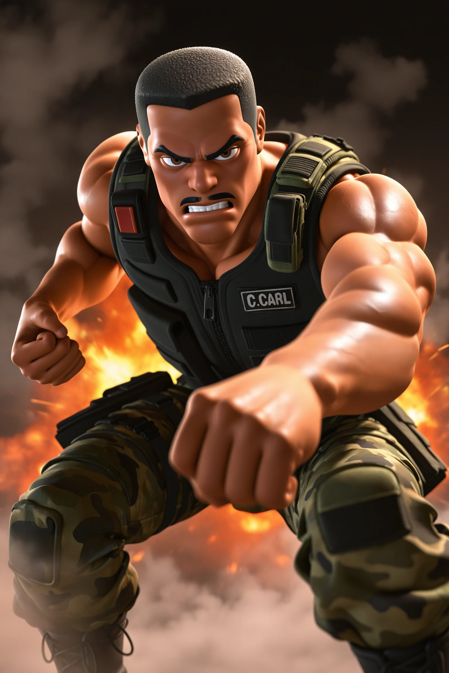 c0mbat_carl, action_figure, plastic_skin, dark skin, no humans, brown eyes, buzz cut, very short hair, sideburns, black mustache, pencil mustache, muscular, muscles, biceps, black vest, utility vest, grenade, camouflage pants, missing hand