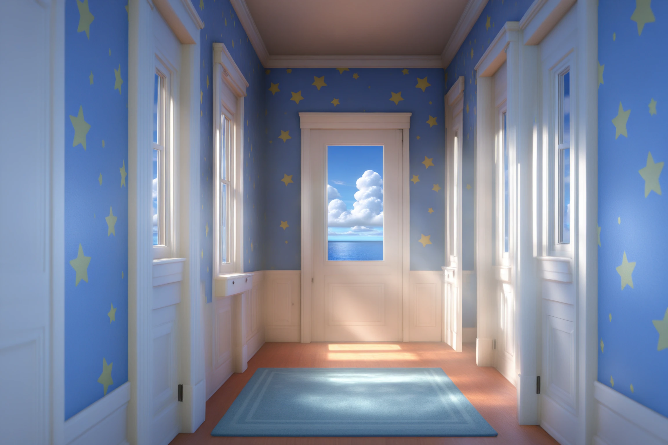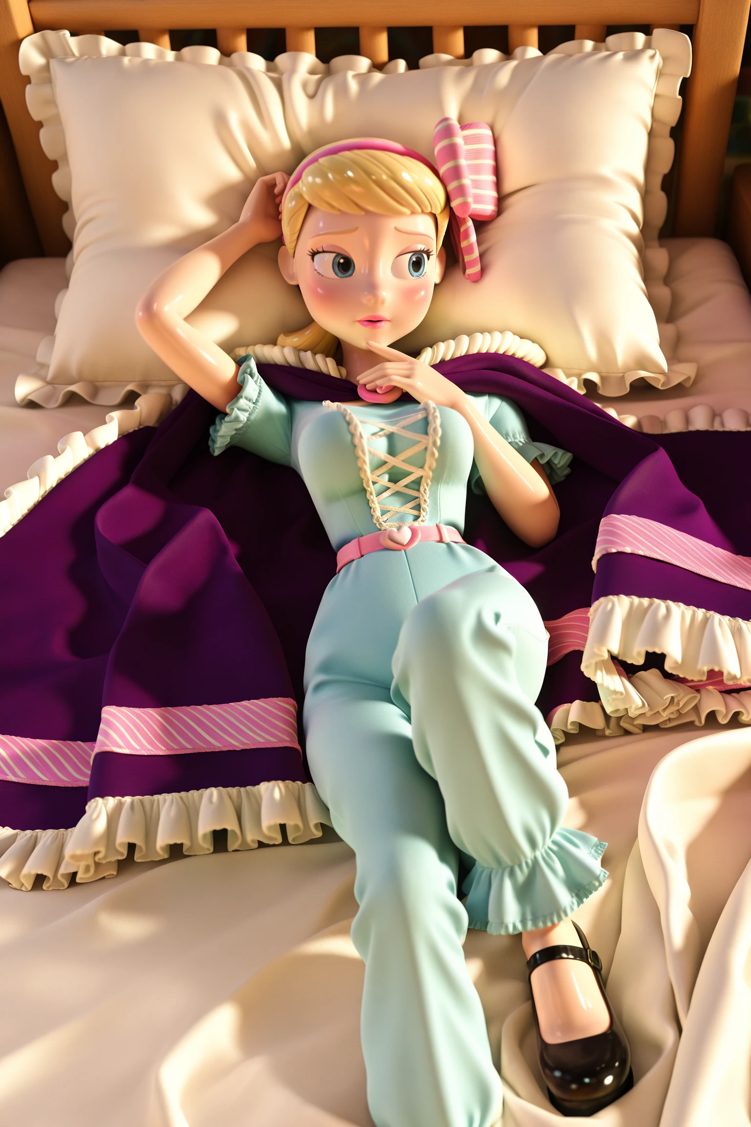 bo_peep_(toy_story), porcelain, doll, no humans, shiny_skin, shiny_hair, blonde hair, blue eyes, pink lips, medium hair, low_ponytail, ringlets, pink hairband, hair bow, pink bow, large bow, striped bow, cross-laced top, blue shirt, short sleeves, frilled sleeves, purple cape, silk cape, frilled cape, two-tone cape, white cape, polka dot, blue pants, frilled pants, mary janes, black footwear