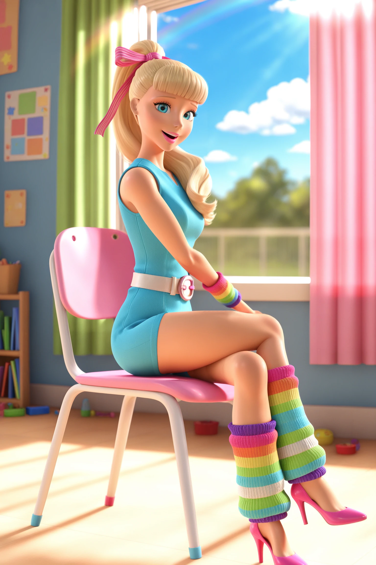 barb1e, doll, plastic_skin, no humans, blue eyes, blonde hair, long hair, blunt bangs, high ponytail <-(or)-> ponytail, pink hair ribbon, pink lips, straight teeth, upper teeth only, sleeveless unitard, blue unitard, pink belt, belt buckle, white belt buckle, leg warmers, multicolored leg warmers, striped leg warmers, pink high heels