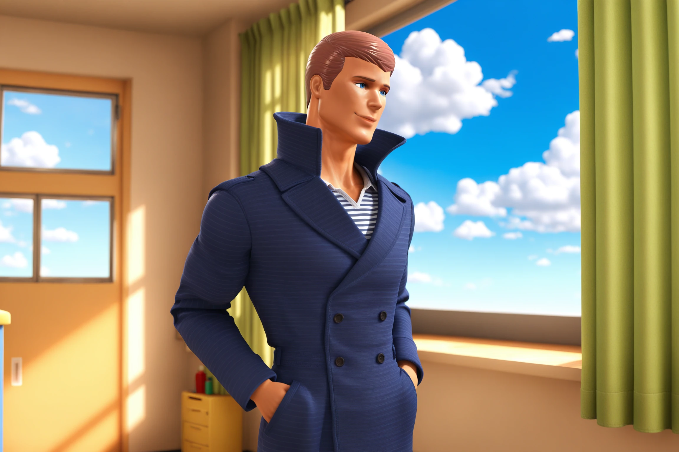 buzz_lightyear, action_figure, plastic_skin, no humans, pointy nose, blue eyes, spacesuit, jetpack, space_helmet, transparent_helmet, fishbowl_helmet, furrowed brow, raised eyebrow, forced smile, wide-eyed