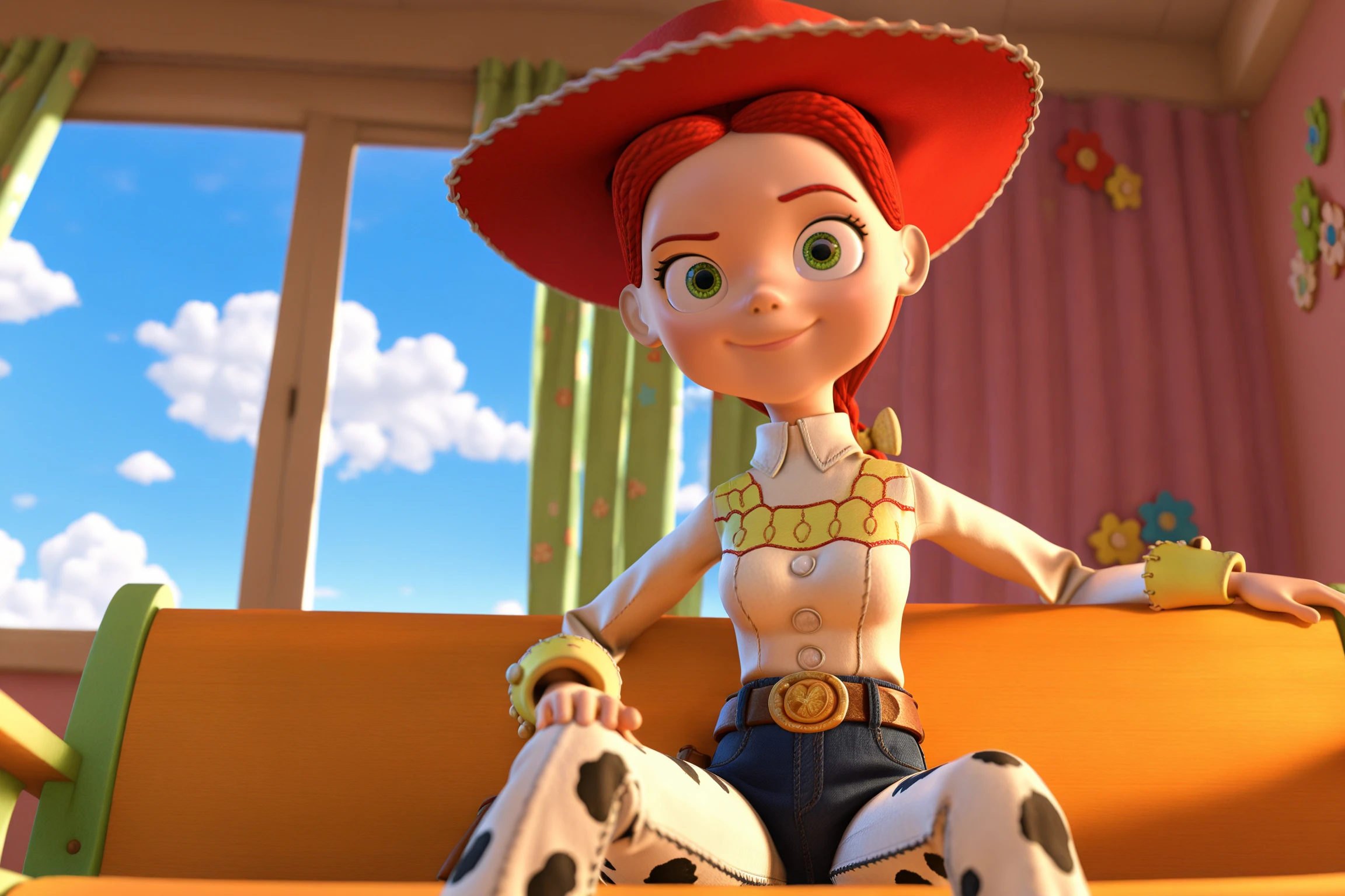 jessie_the_yodeling_cowgirl, rag_doll, doll, plastic_skin, no humans, green eyes, red hat, cowboy hat, snub-nosed, button_nose, upturned nose, red hair, long hair, braided hair, single braid, hair bow, yellow bow, yoke_(clothing), collared shirt, white shirt, long sleeves, belt buckle, brown belt, jeans, denim, chaps, print chaps, brown boots, cowboy boots, cowgirl_(western)