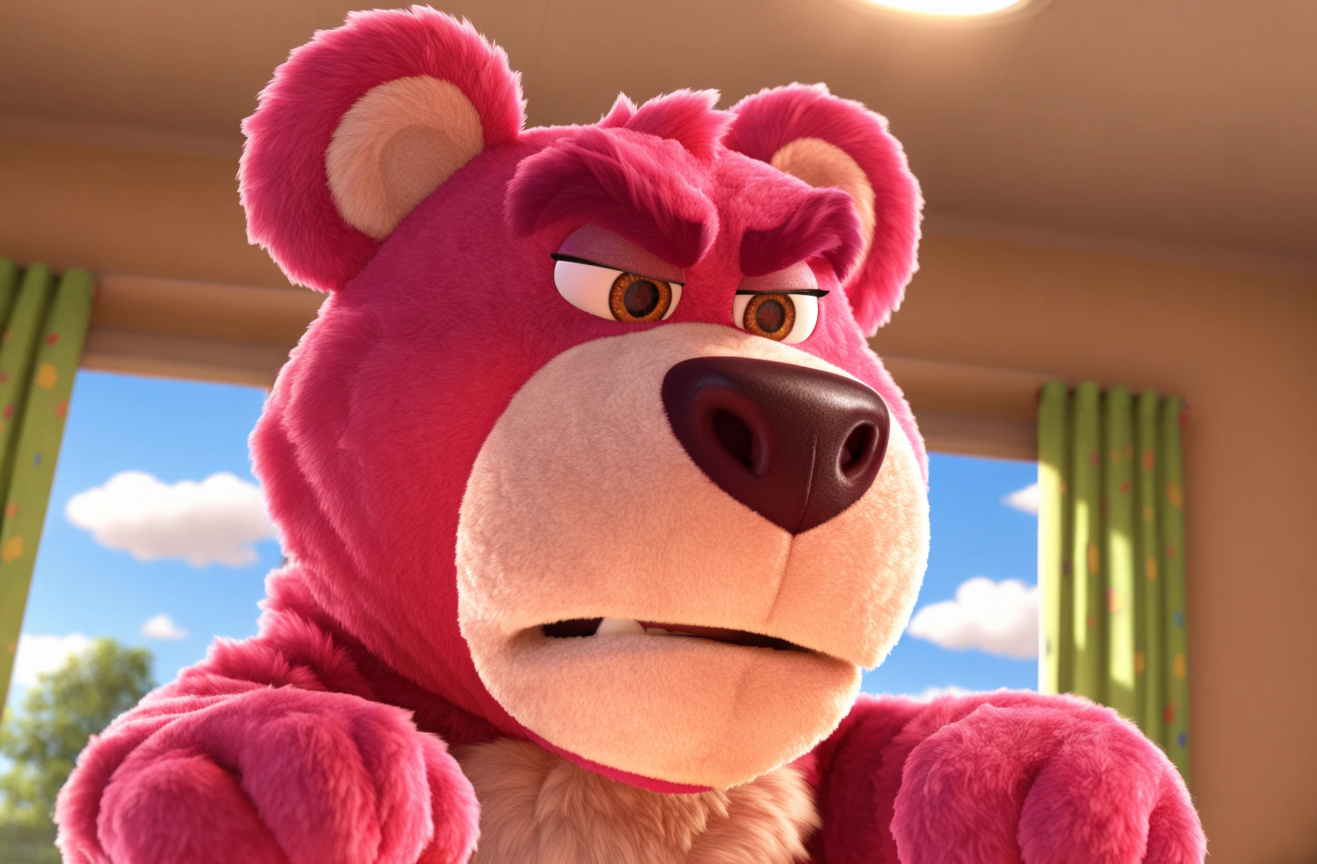 lots-o'-huggin'_bear_(toy_story), stuffed animal, bear, no humans, brown eyes, pink fur, dirty fur, holding cane, plush, angry, glaring, shaded face