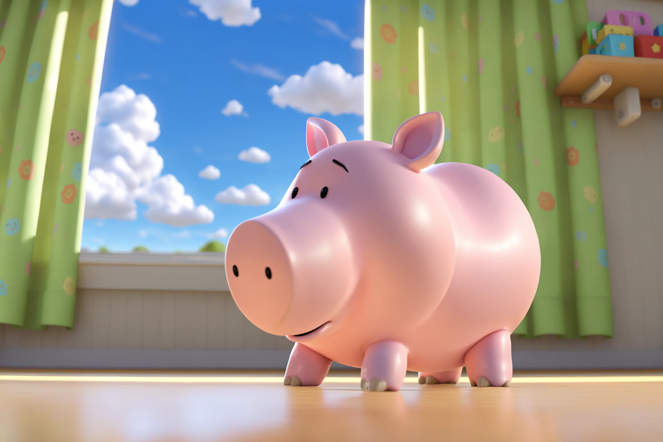 hamm_(toy_story), pig, piggy_bank, plastic_skin, no humans, dot eyes, ._.