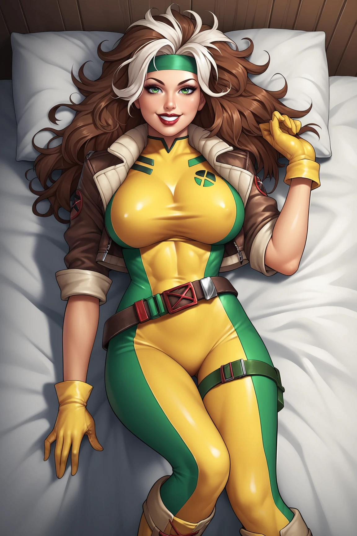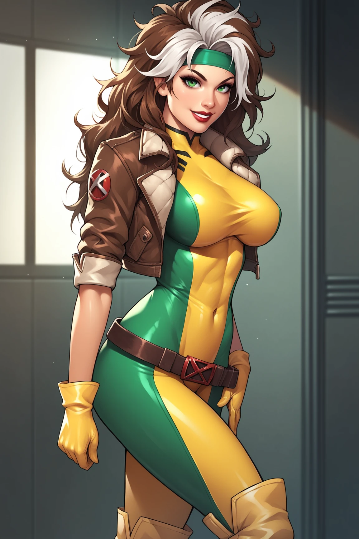 ā RogueXMXL, green eyes, lipstick, brown hair, two-tone hair, long hair, messy hair, headband, big breasts, cropped jacket, brown jacket, yellow bodysuit, long bodysuit, yellow gloves, belt, yellow boots