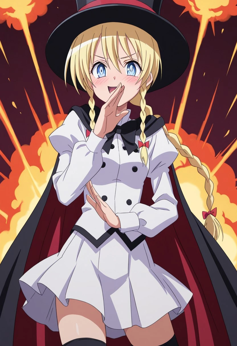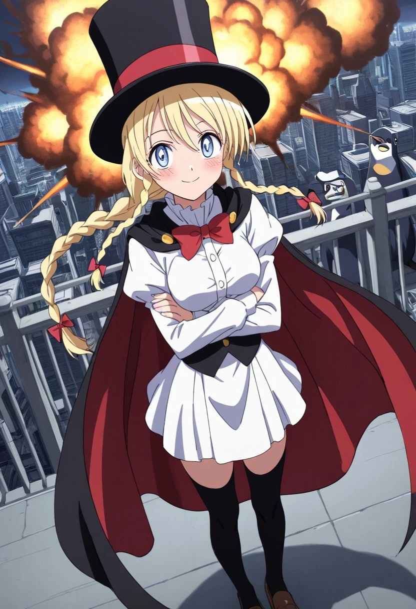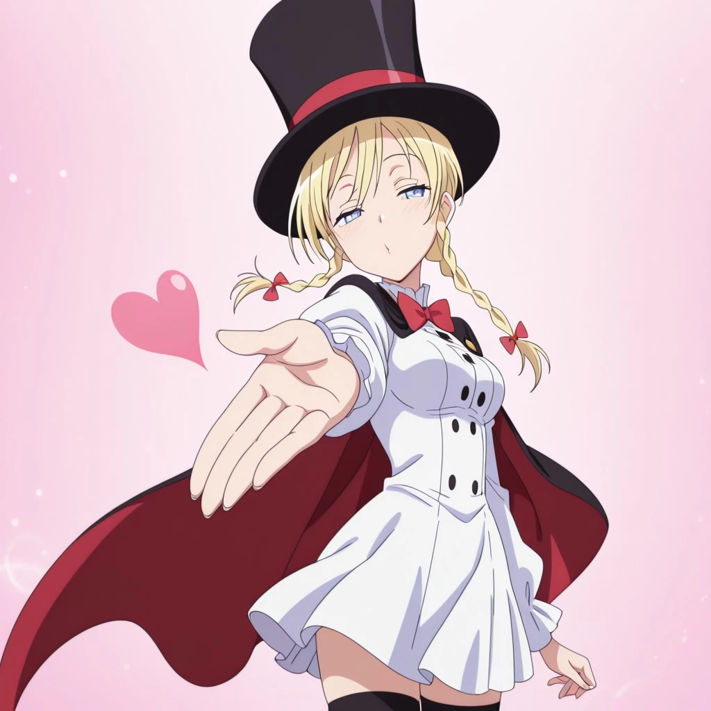 Outfit 01: thighhighs, hat, cape, zettai ryouiki, top hat, puffy sleeves, long sleeves, bowtie, white dress, white skirt, white shirt, buttons,
