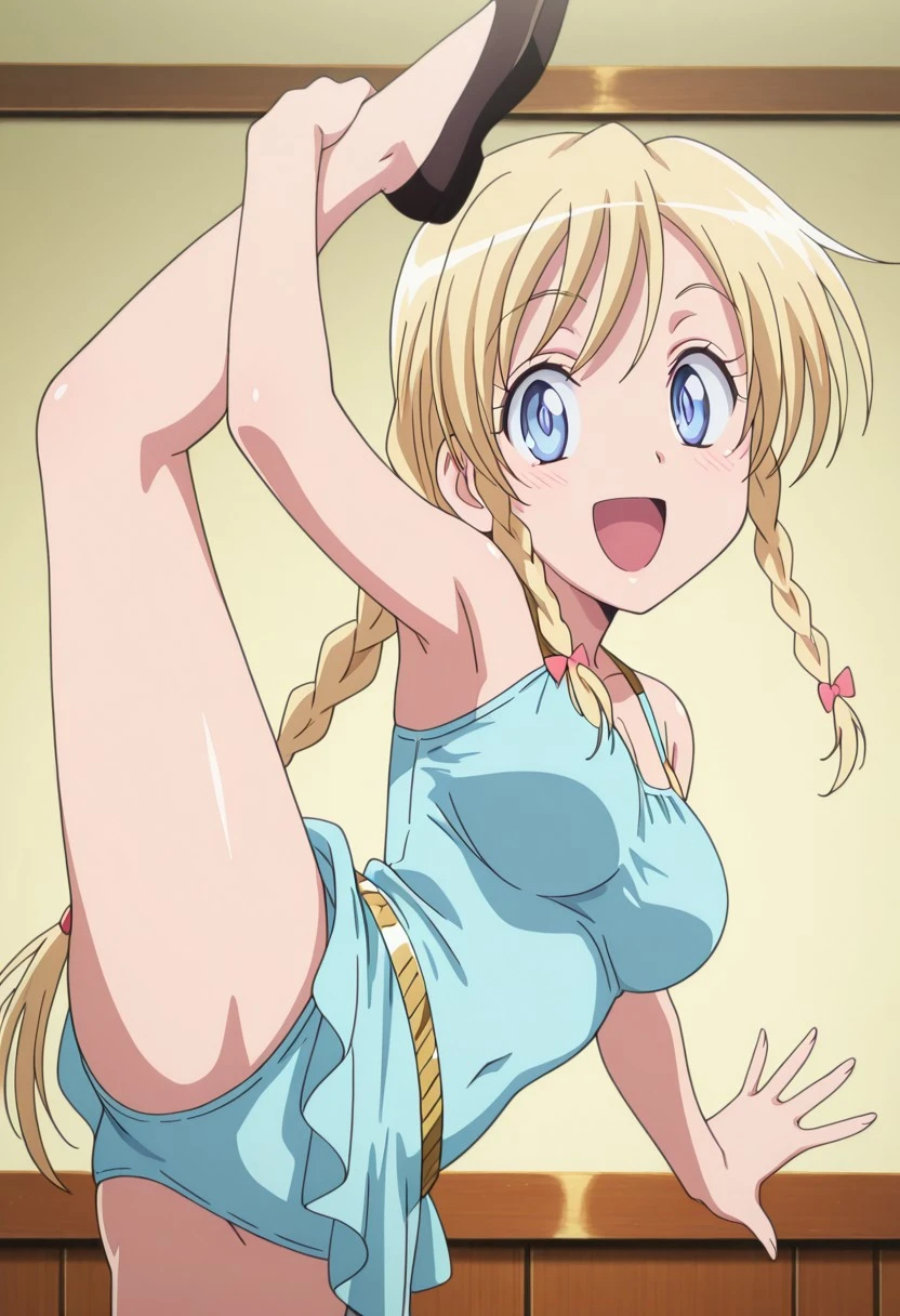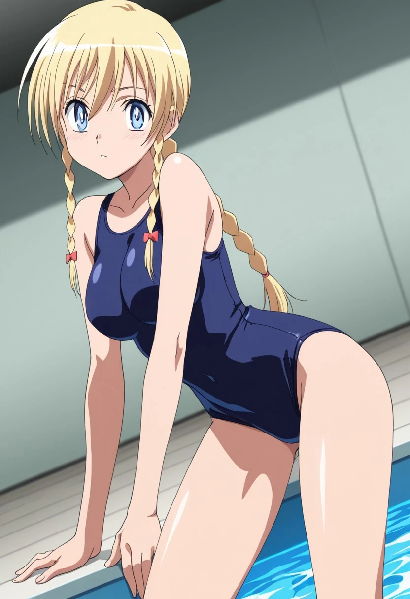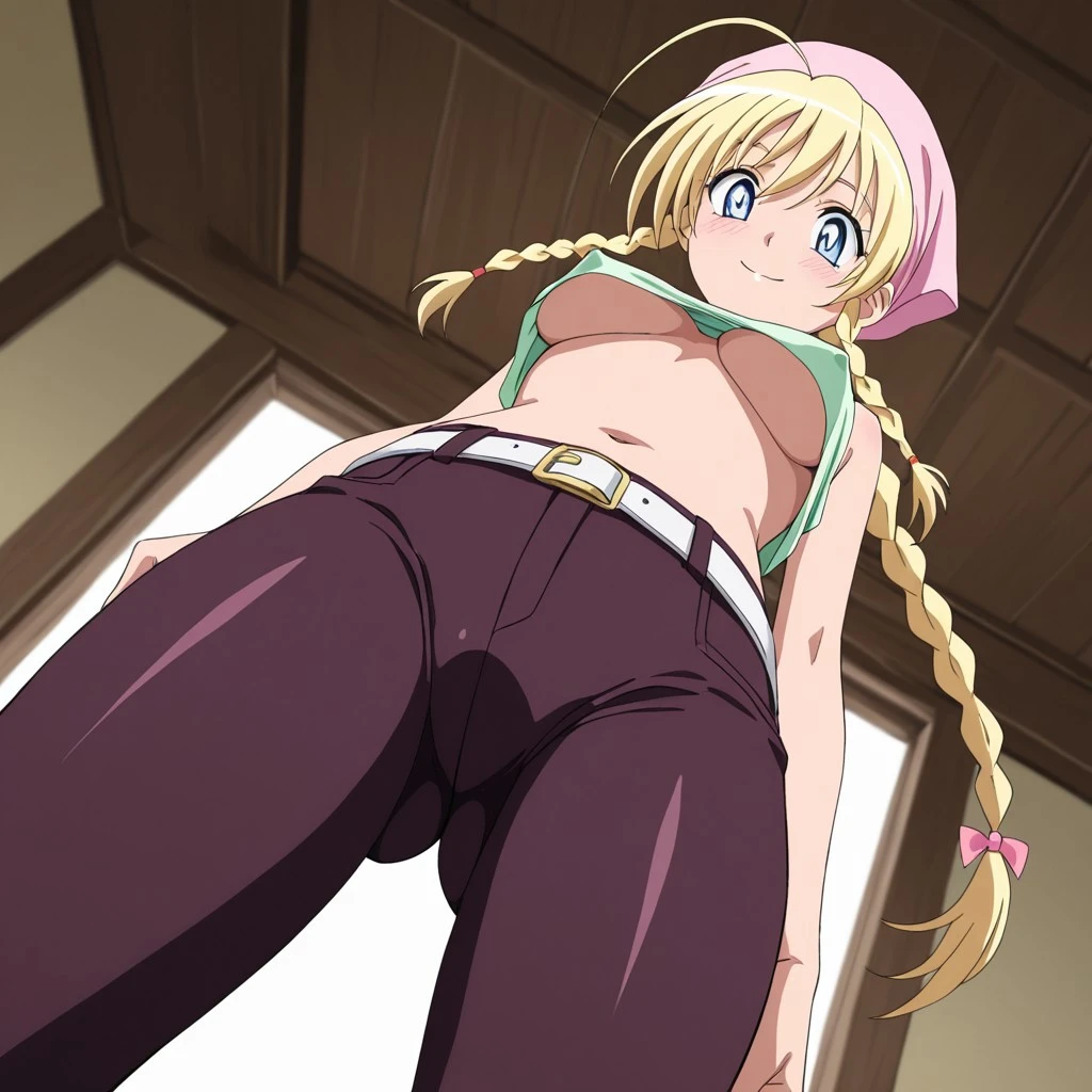 Trigger: rikantz, light blue eyes, blonde hair, braid, twin braids, braided long ponytail, medium breasts,young adult,