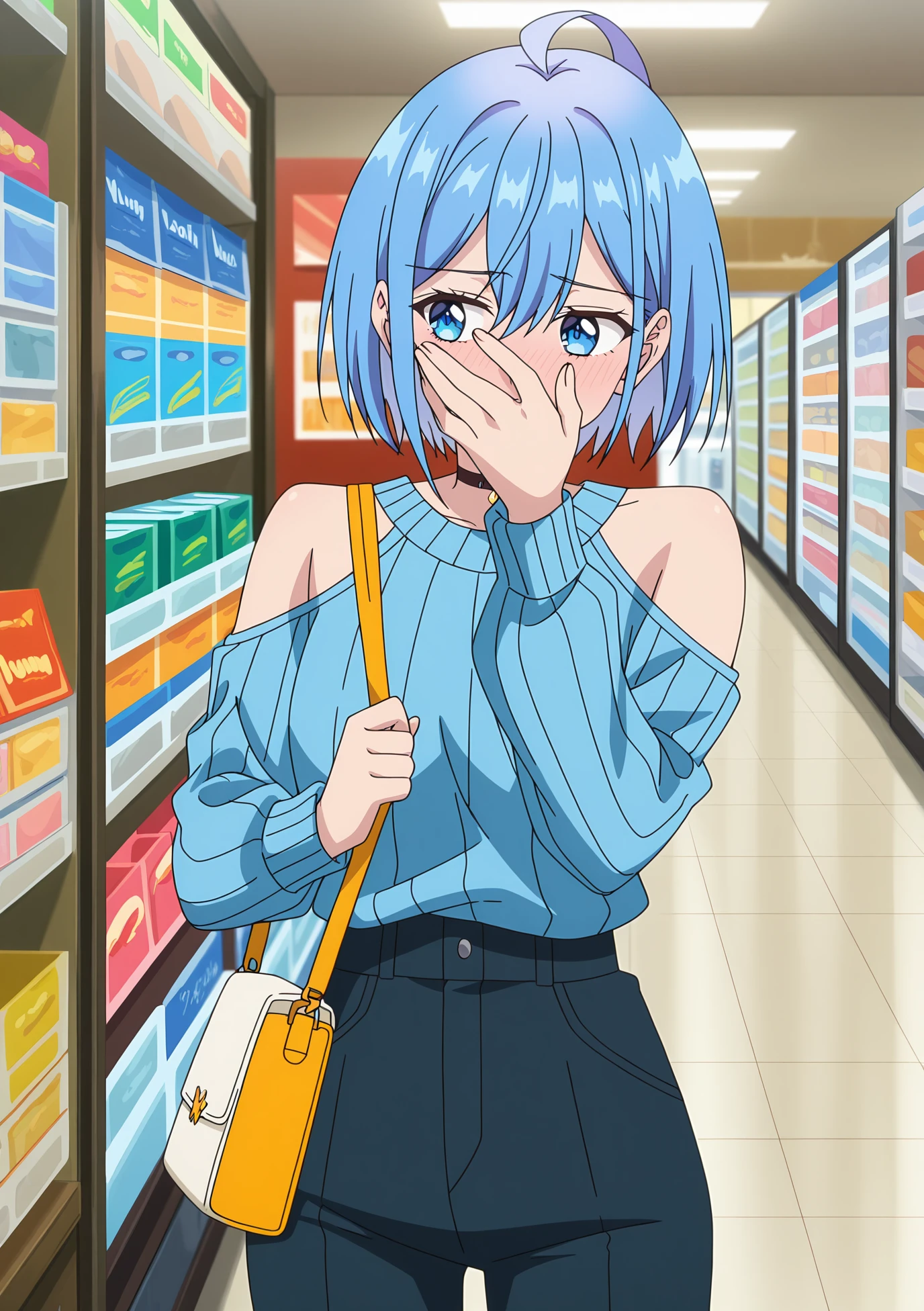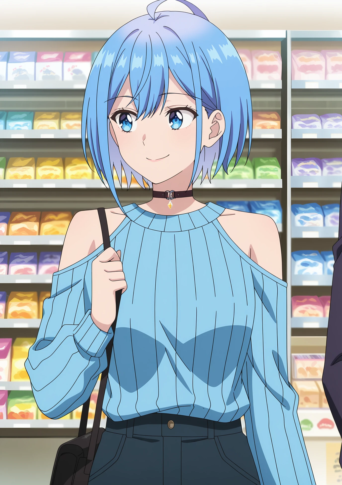 pants, shoulder cutout, bag, clothing cutout, sweater, bare shoulders, handbag, blue sweater, long sleeves, shoulder, blue pants