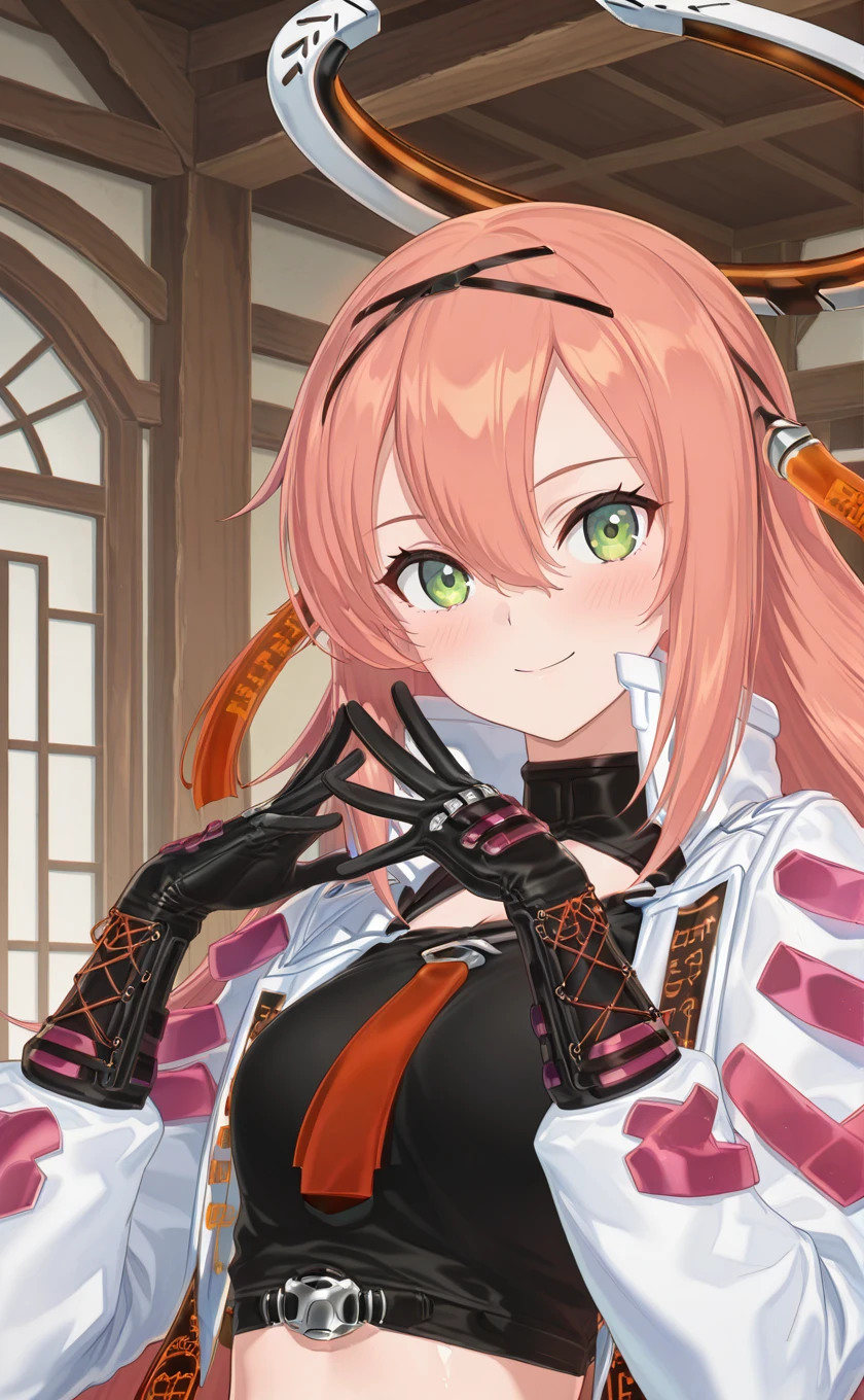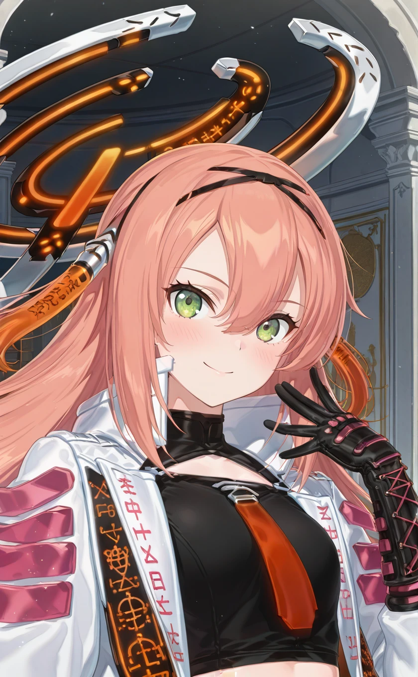 halo,long hair,pink hair,black hairband,hair between eyes,green eyes