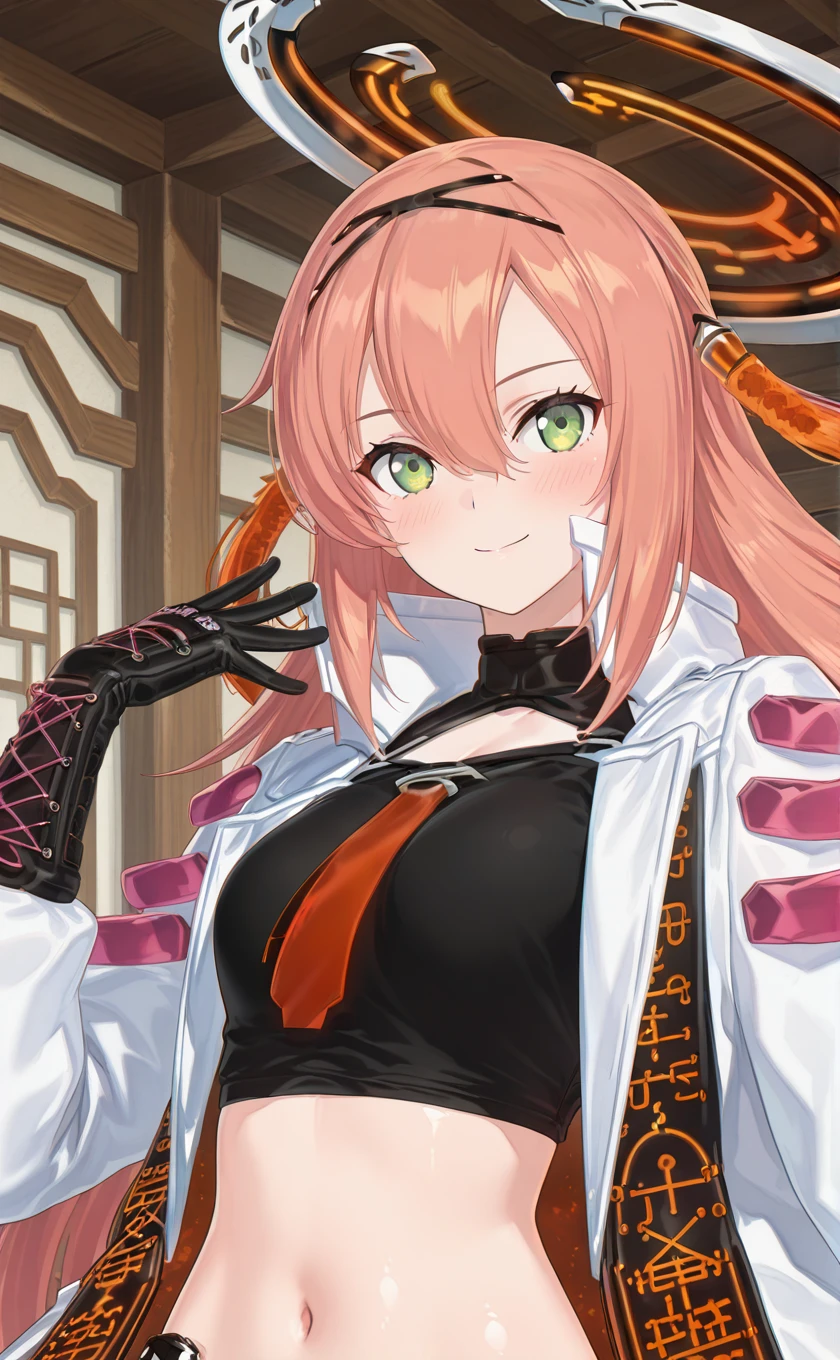 white coat,,black shirt,crop top,midriff,red short necktie,long sleeves,black gloves,navel,stomach,belt pouch,miniskirt,black skirt,black thighhighs,zettai ryouiki,knee boots,cross-laced footwear,black footwear