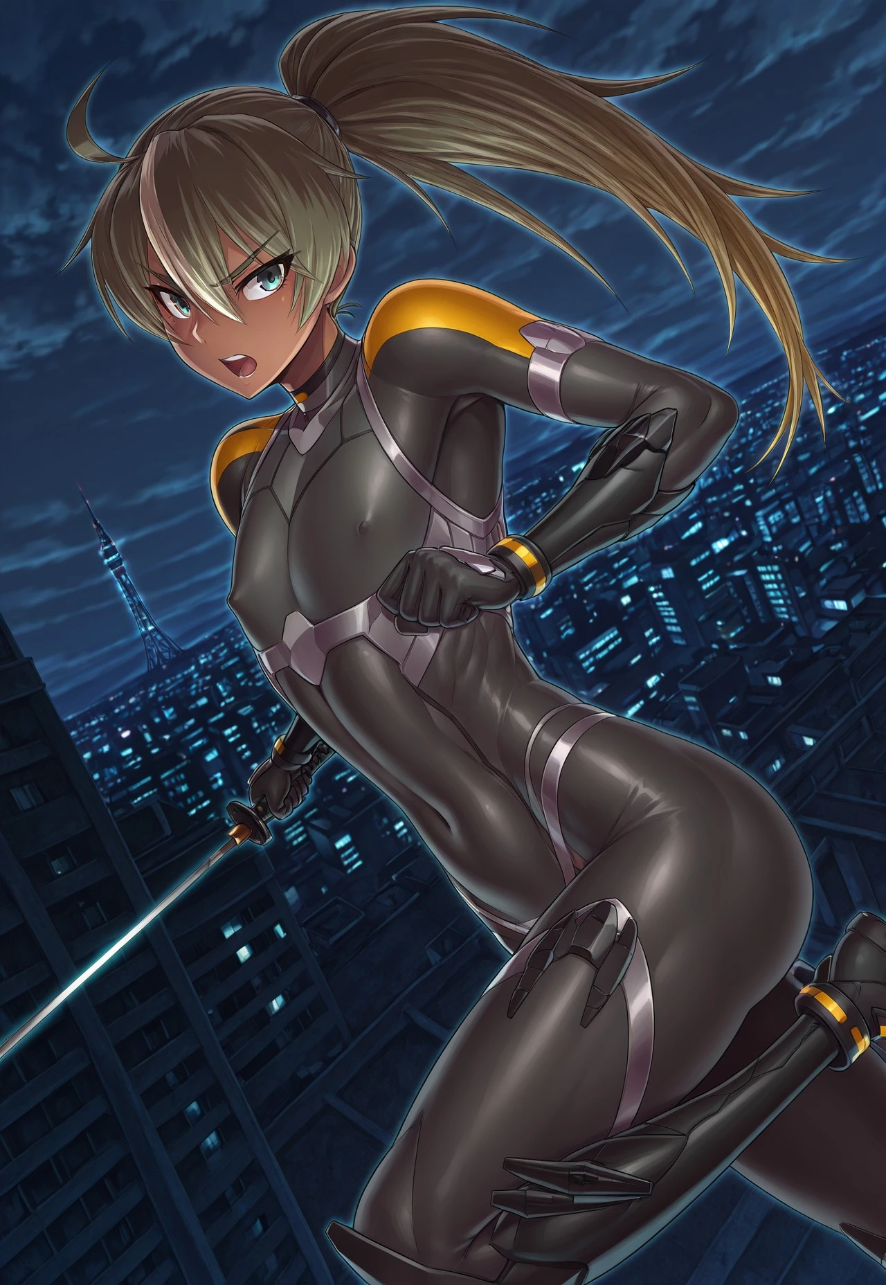 Tags: androgynous, tenma yayoi, dark skin, long hair, high ponytail, ahoge, two-tone hair, blond-brown hair, blue-green eyes,