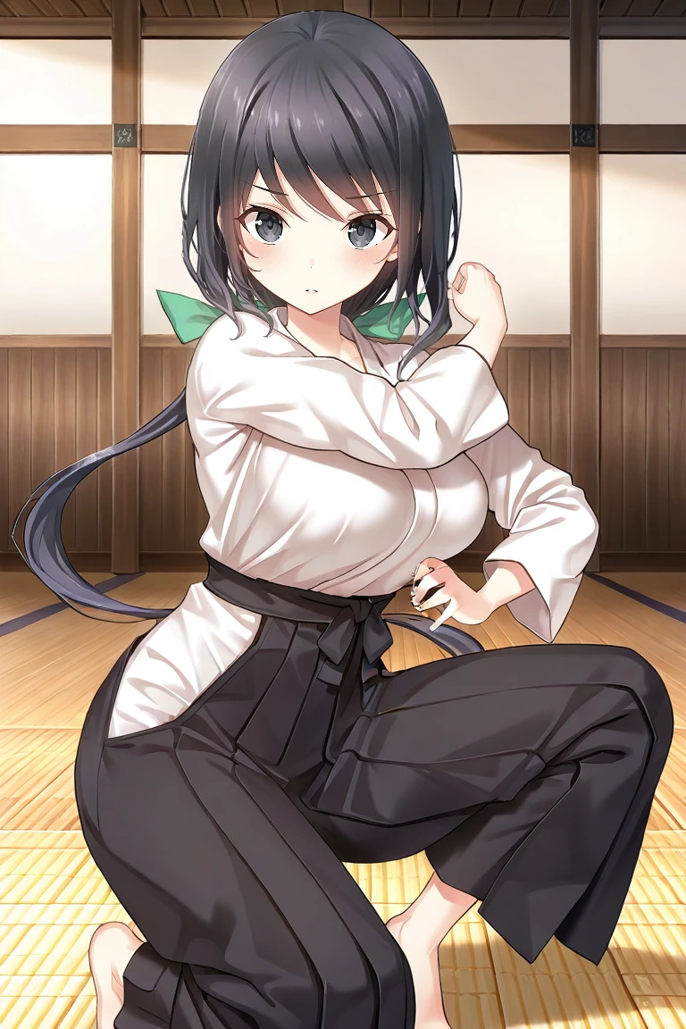 judo outfit, Japanese clothes, black hakama, long sleeves, wide sleeves, barefoot, (sports bra)