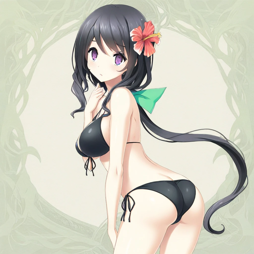 black swimsuit, black bikini, side-tie bikini bottom, front-tie top, hair flower,hibiscus