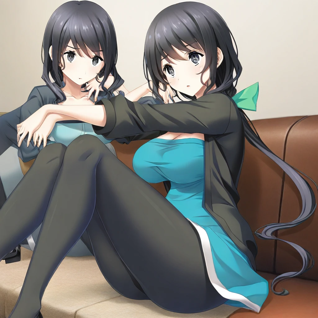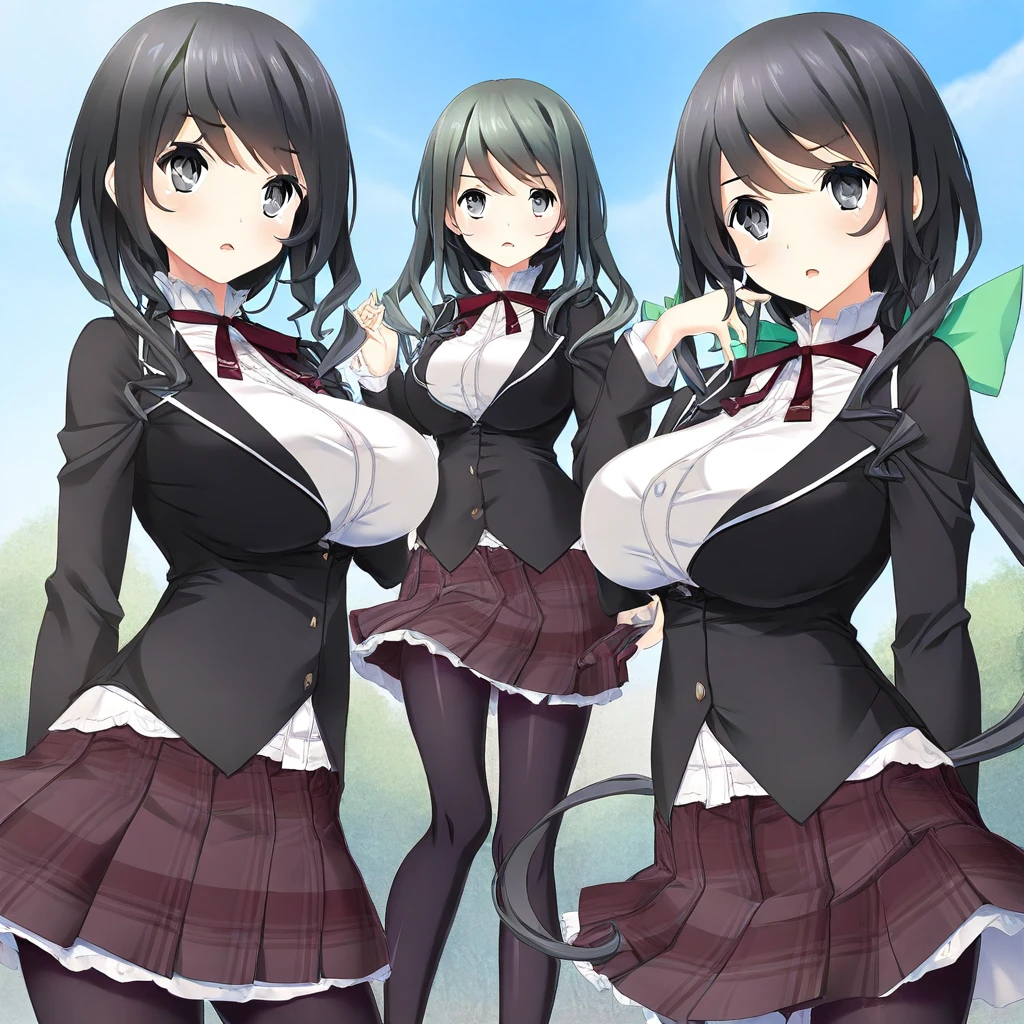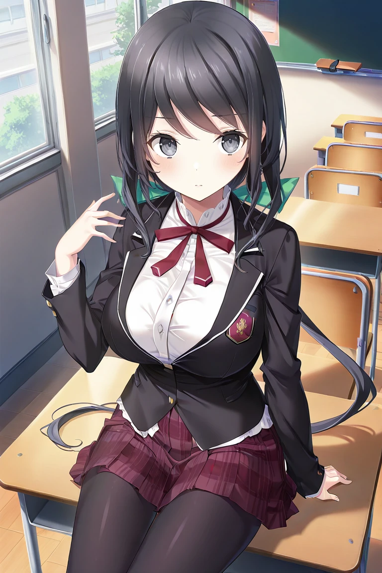 black hair, very long hair, bangs, ponytail, green hair ribbon, gray eyes, large breasts,