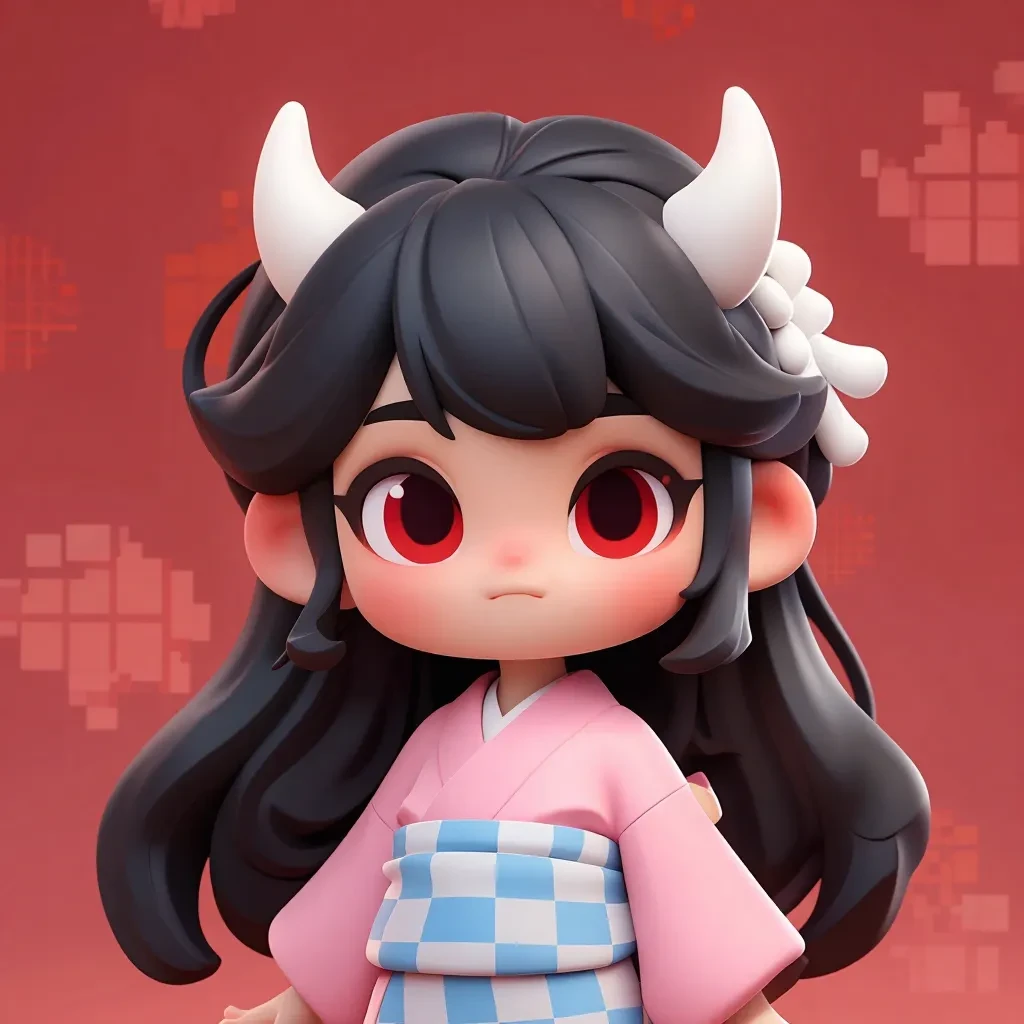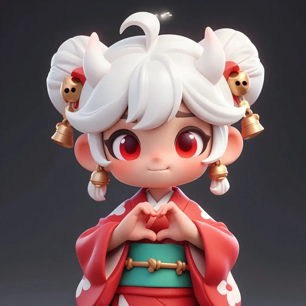 BMStyle, chibi 3D, blind box style, 1girl, solo, oni girl, white hair, twin buns, red eyes, small white horns, golden bell hair ornaments, heart hands gesture, red kimono, green obi, upper body, front view, glossy PVC texture, soft lighting