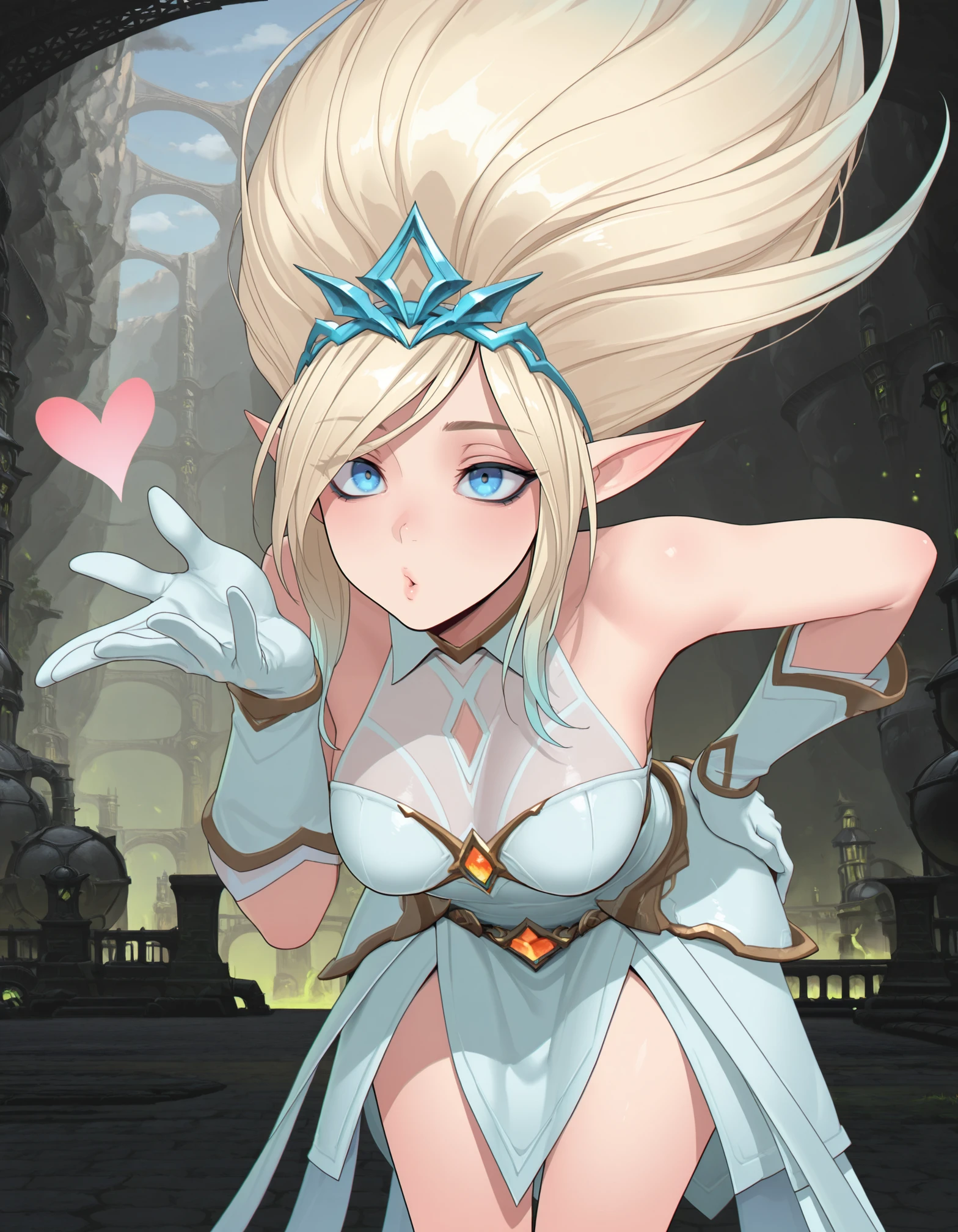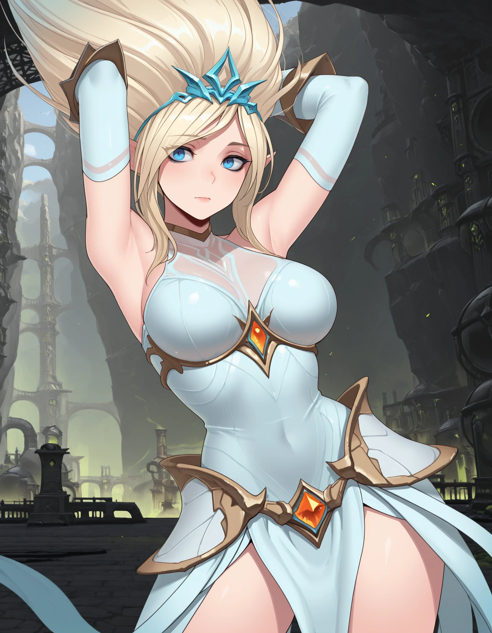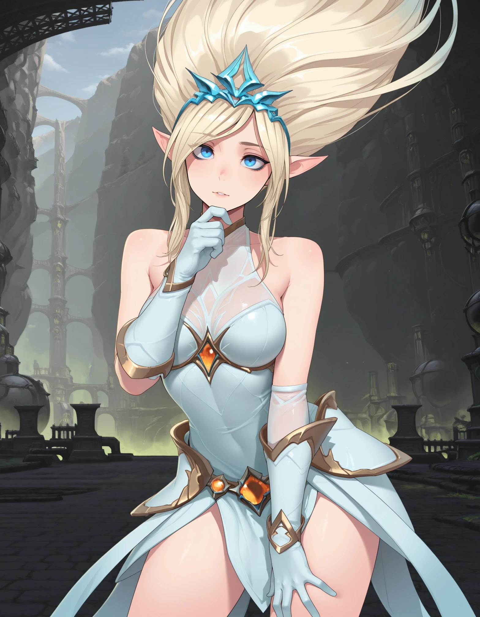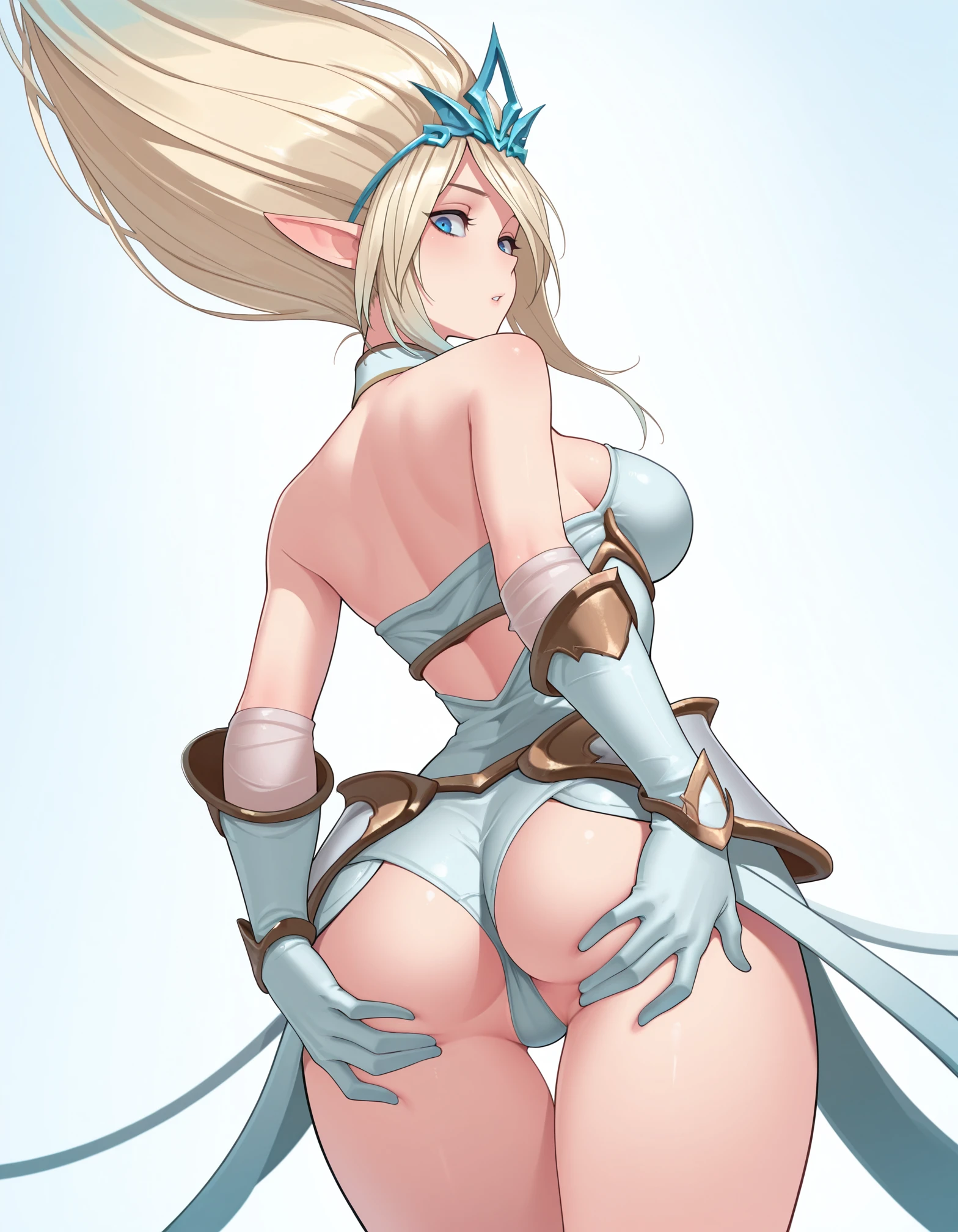 Wild Rift outfit tags: "janna, blue eyes, tiara, collared dress, bare shoulders, gloves, greaves, bare feet"
