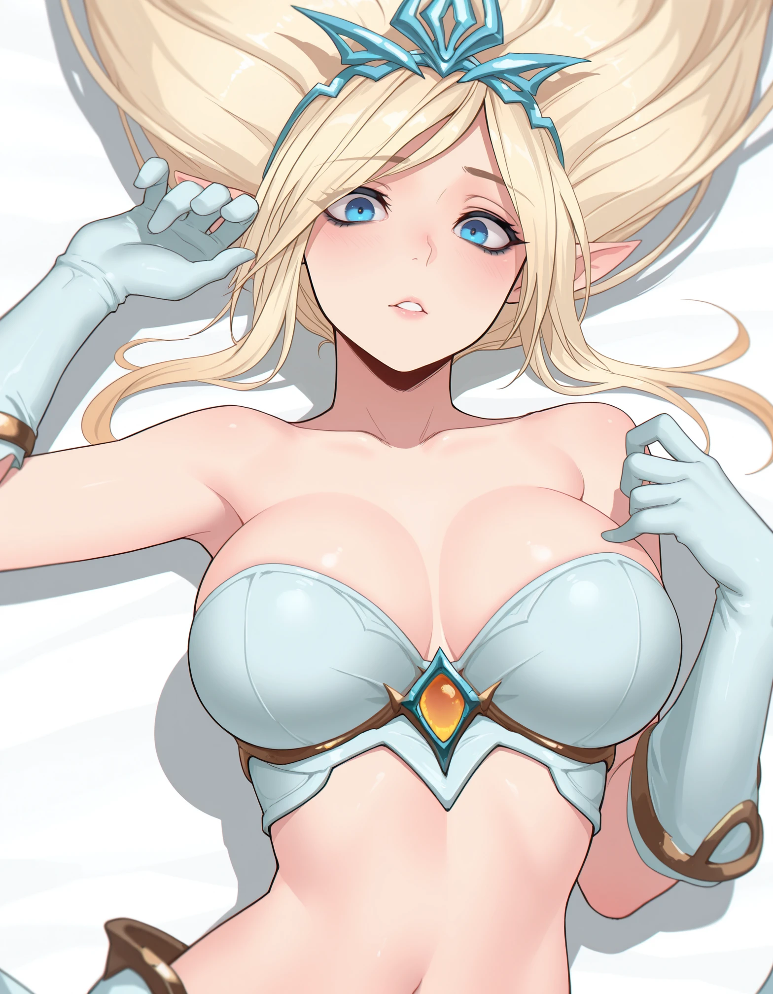 League of Leagues outfit tags: "janna, blue eyes, tiara, strapless bra, naval, bare shoulders, gloves, greaves, bare feet"
