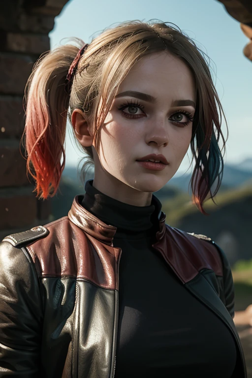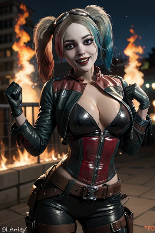 Harley,multicolored hair,makeup,twintails,(open mouth:0.8),teeth,(smile:0.8), goggles on head,belt,pants,black gloves,corset,holster,open cropped jacket,navel,cleavage, standing,upper body, nighttime,explosion, (insanely detailed, beautiful detailed face,beautiful detailed eyes, masterpiece, best quality),solo,