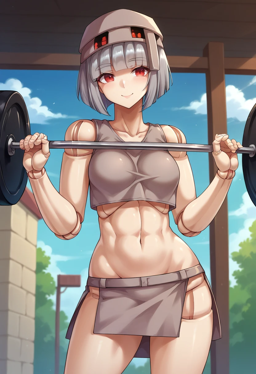 jeloirgo, grey hair, red eyes, doll joints, hat, crop top, short skirt, side slit