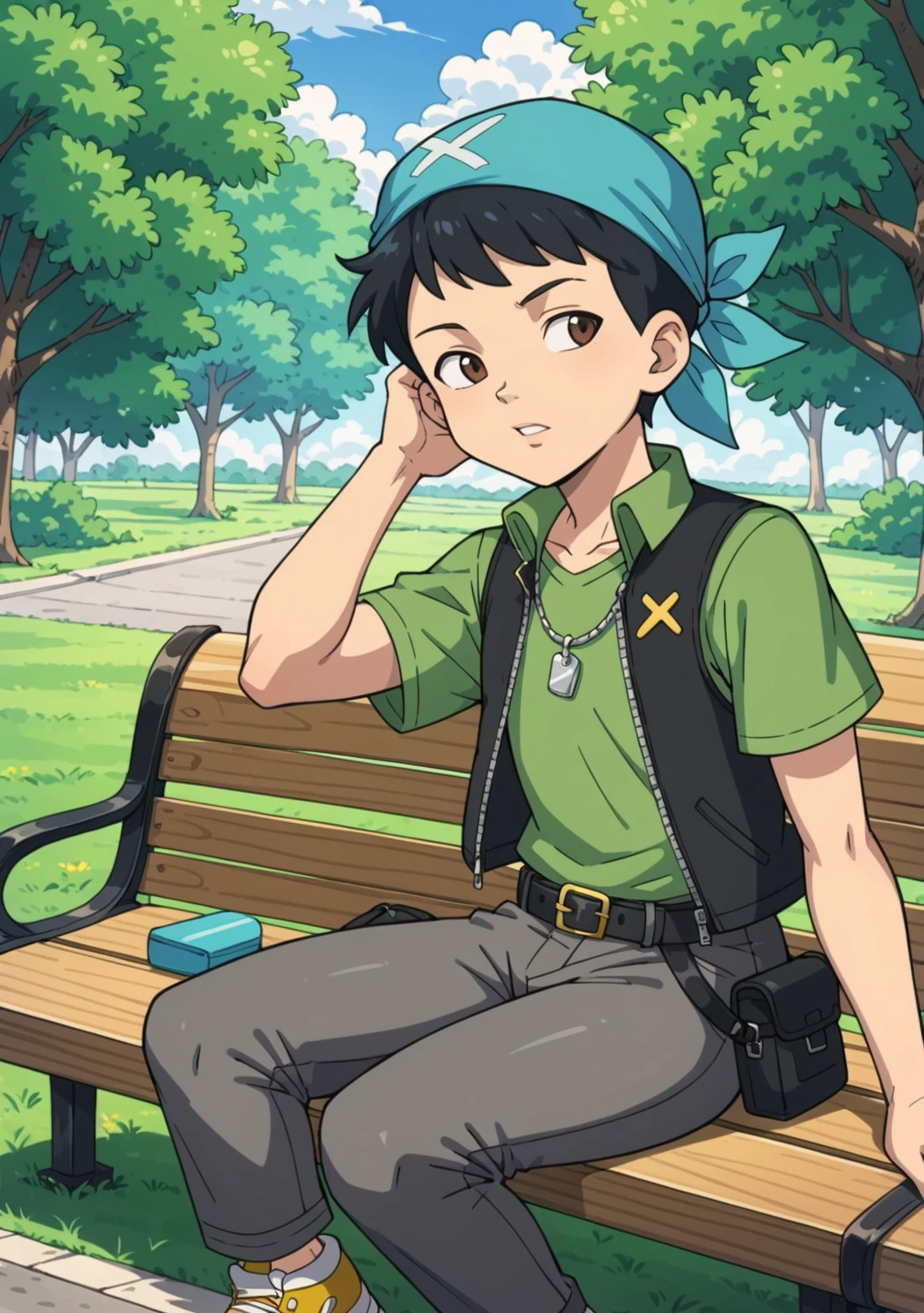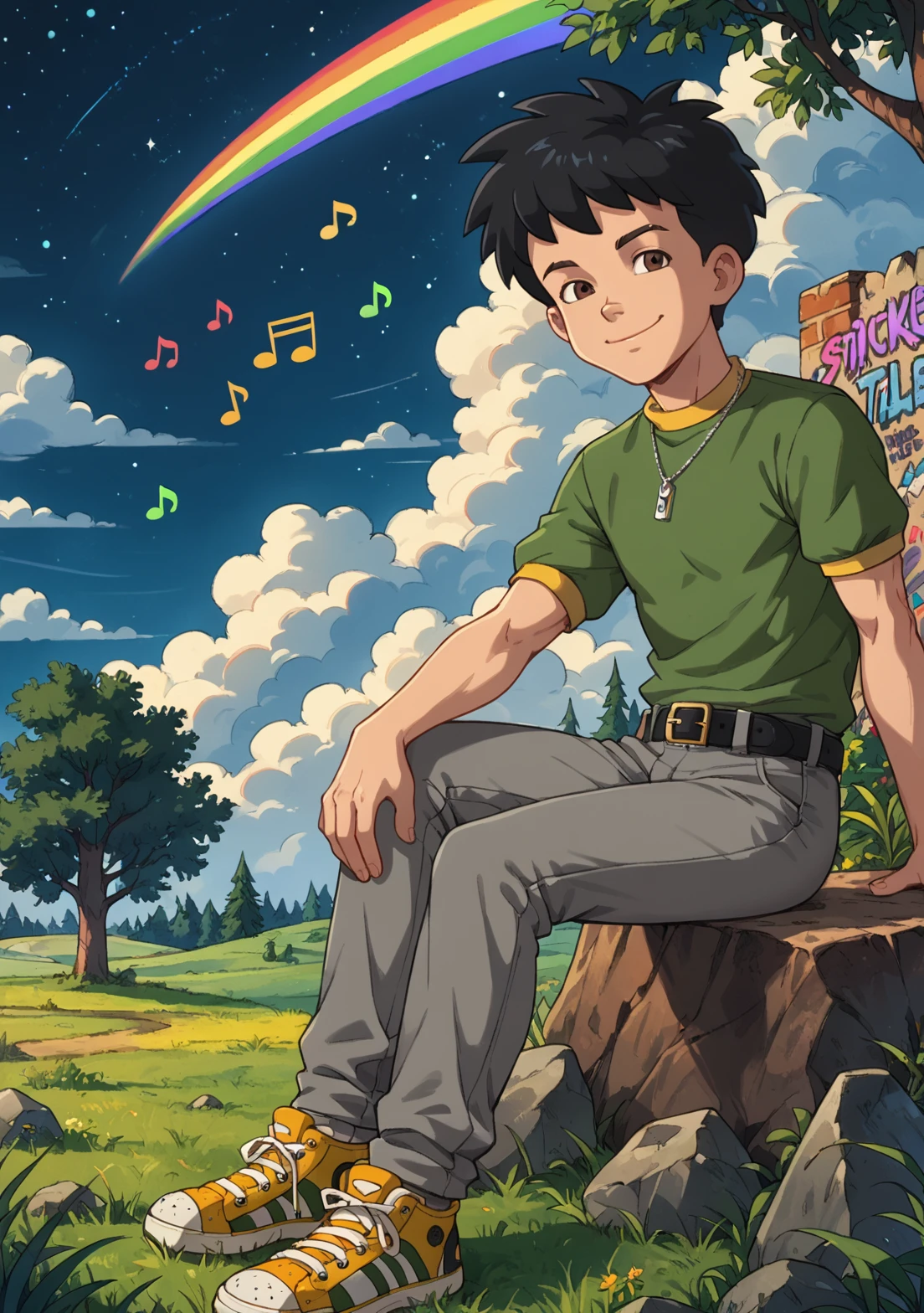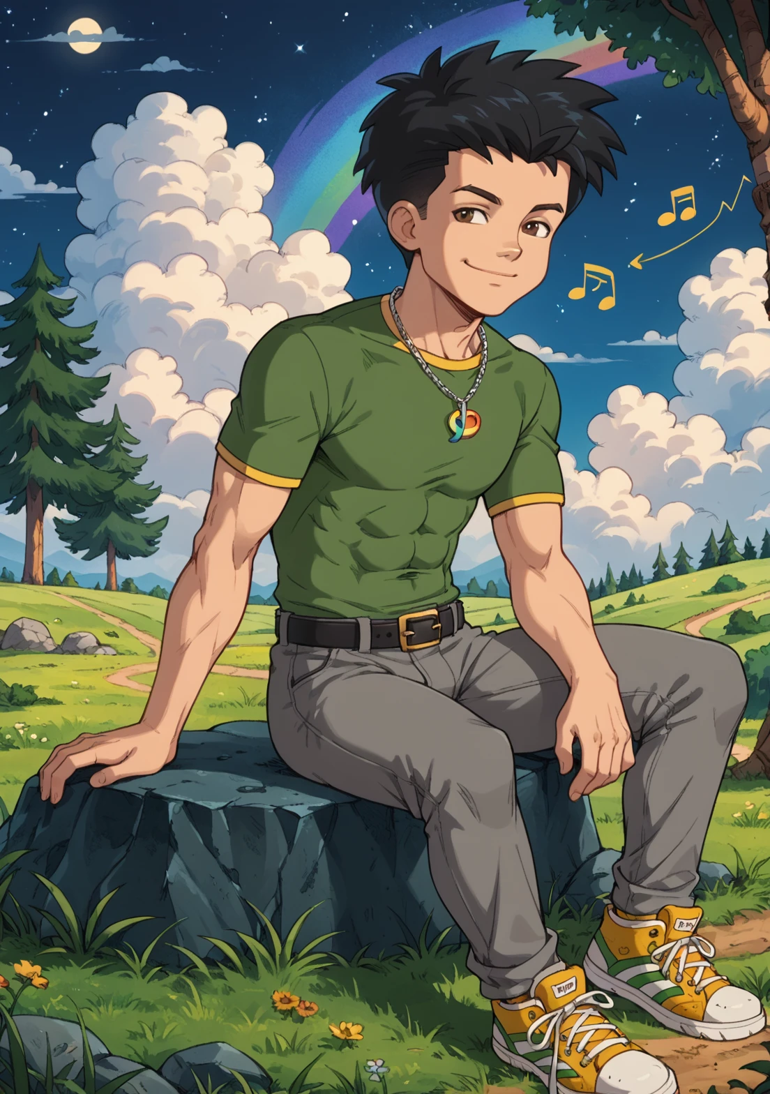 1boy, solo, black hair, short hair, green shirt, grey pants, dark golden footwear, dark golden sneakers