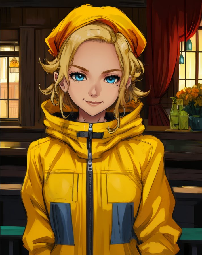 long sleeves with Japanese text, yellow raincoat , zipper, orange bandana,