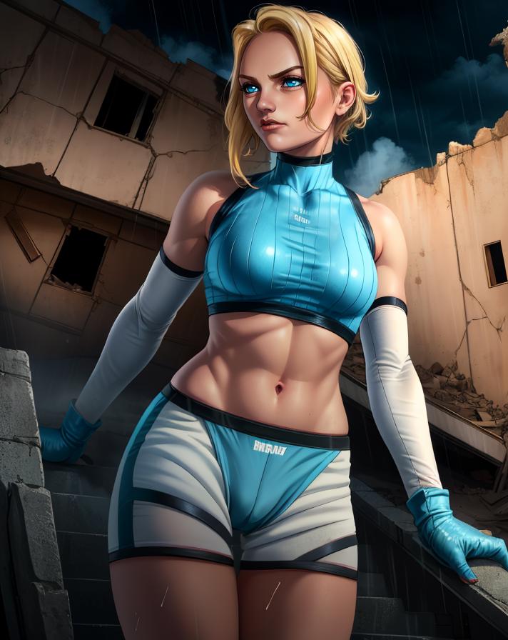 • her alternative was -fingerless gloves,black panties,choker,long chaps,sleeveless,black bra, cleavage, midriff, - elbow gloves, in NEG