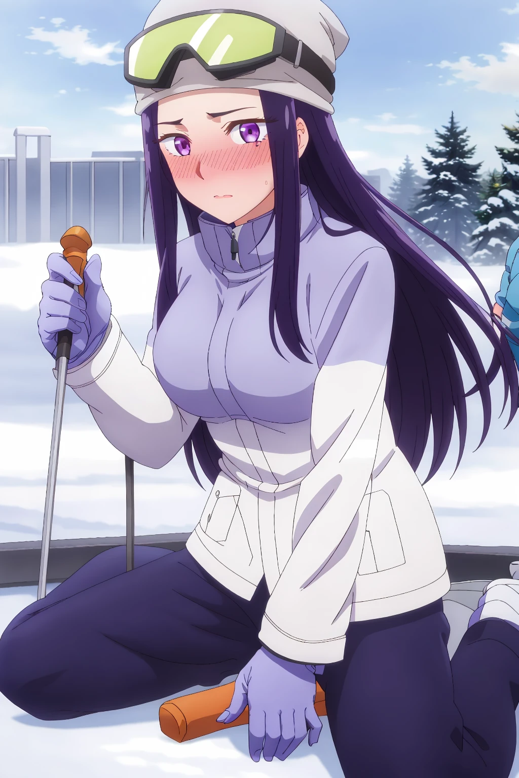 gloves, goggles, winter clothes, helmet, glasses, hat, beanie, goggles on head, pants, winter coat