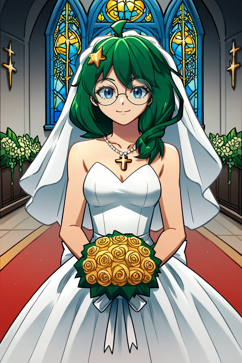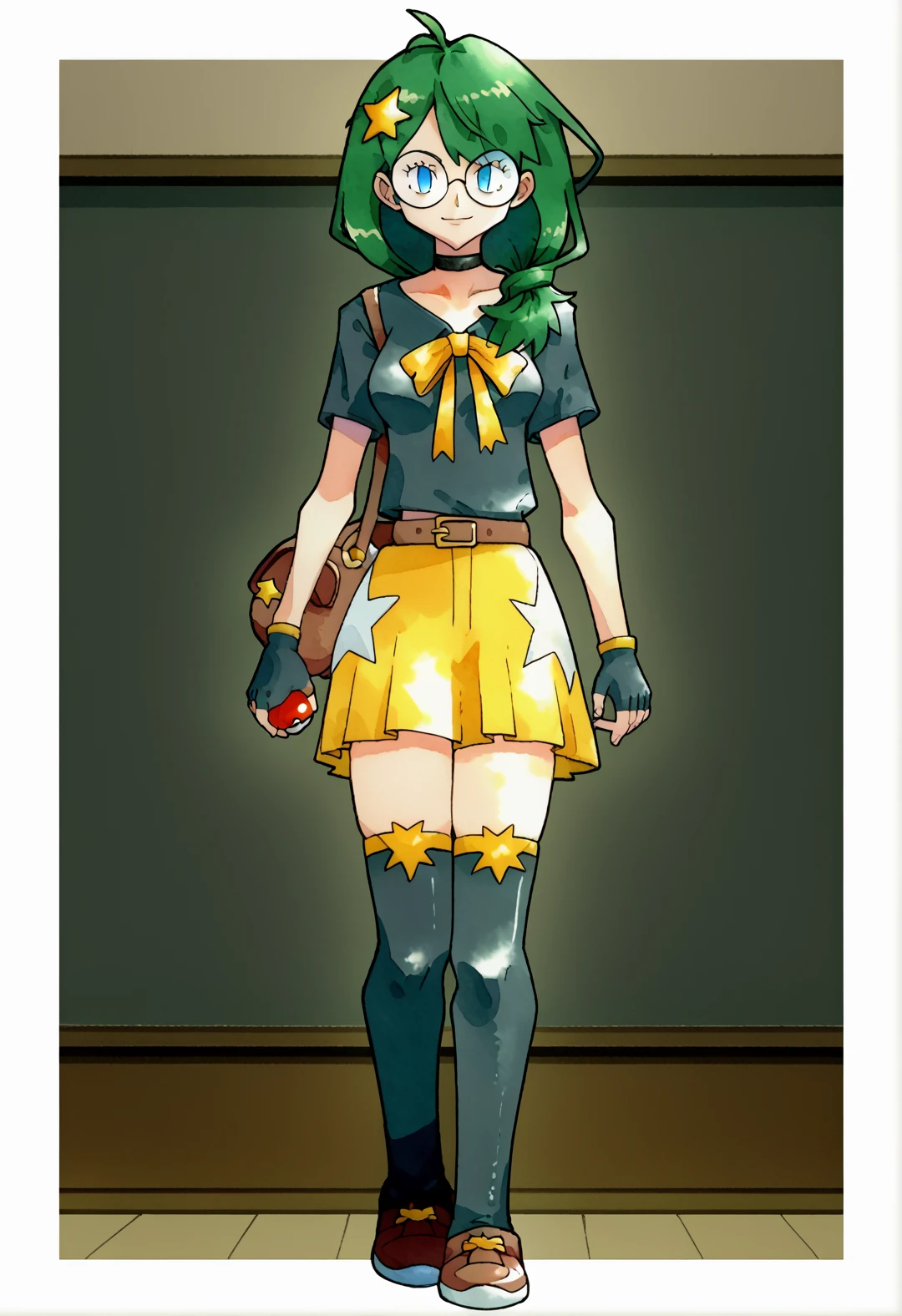rival ivy, 1girl, green hair, blue eyes, long hair, hair over shoulder, yellow star hair ornament, ahoge, round glassesHer outfit is: