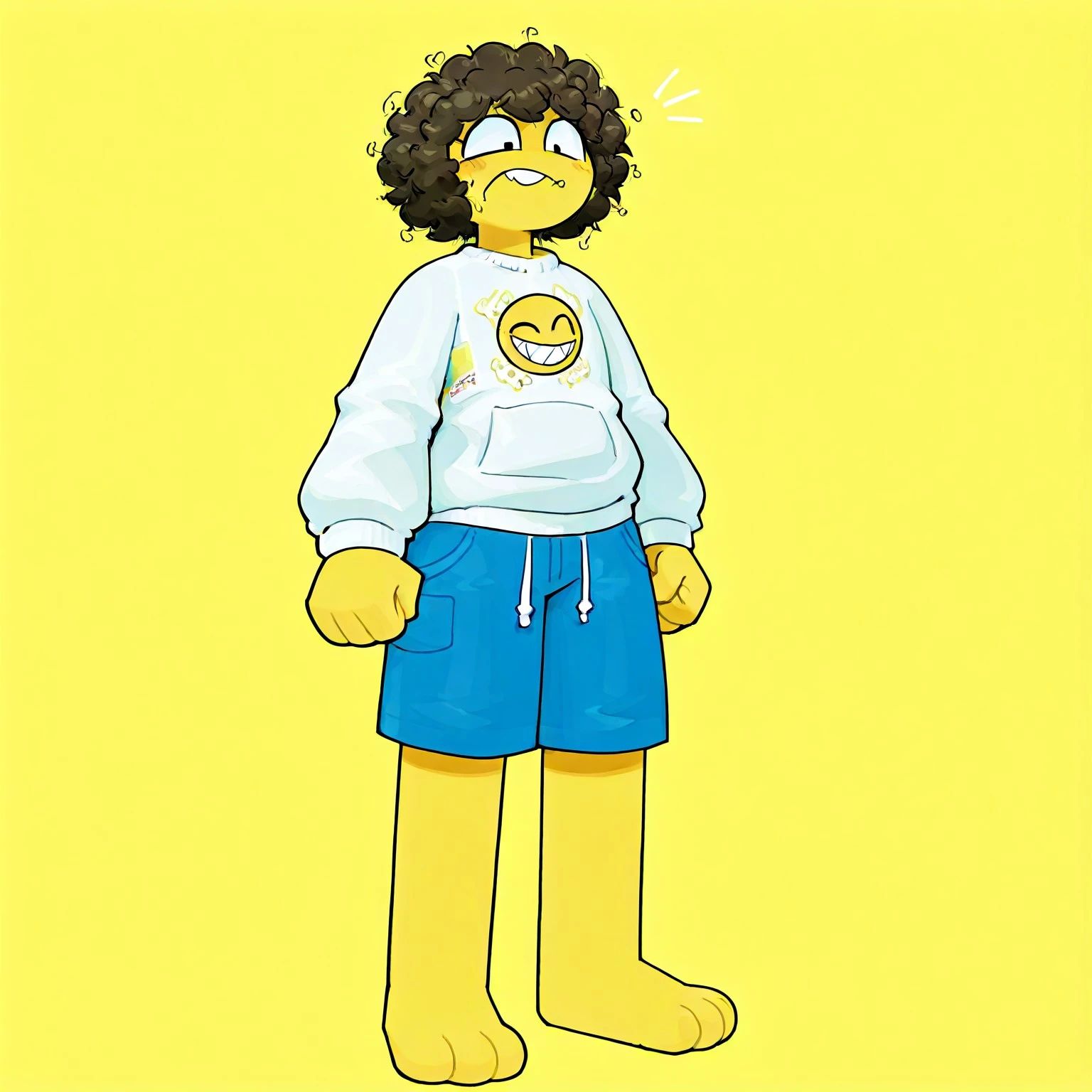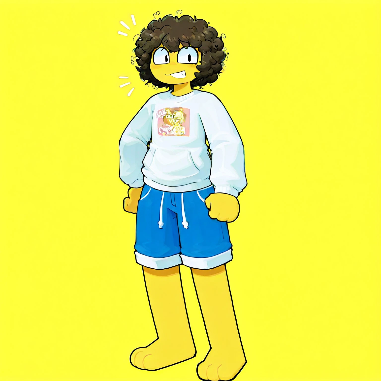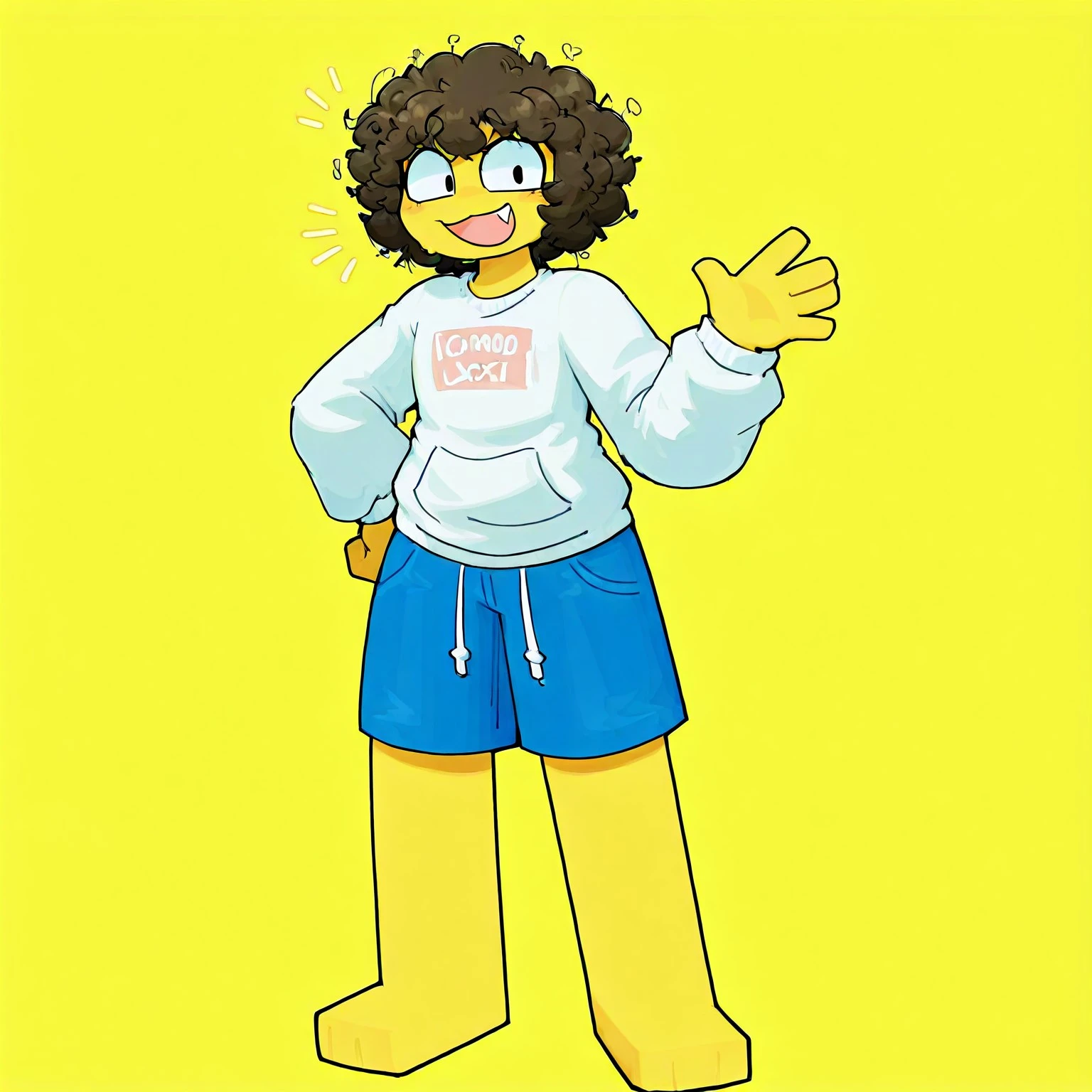 anthro, cartoony, roblox body, yellow skin, messy curly hair, brown hair, white sweatshirt, blue shorts,