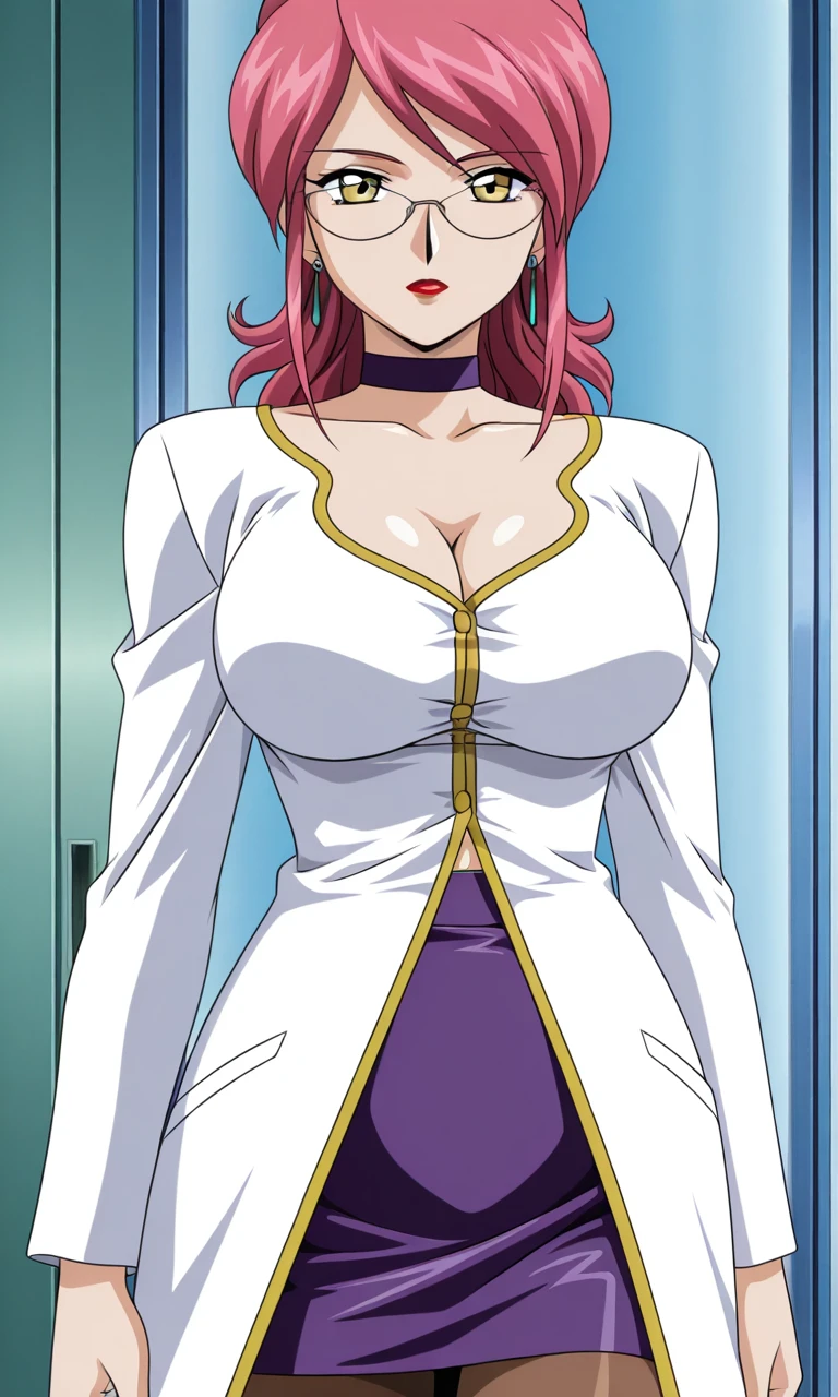 1girl, pink hair, yellow eyes, glasses, earrings, red lips, lipstick, jewelry, pantyhose, cleavage, ,choker ,anime screencap, anime coloring , skirt, large breasts, white long shirts,