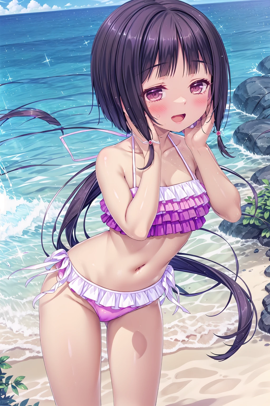 arisegawa_White_pink_purple_bikini_Side-tie_bikini_bottom_Frilled_bikini, arle, white_ribbon, hair_ribbon, halterneck, midriff, navel, pink_panties, feet, toes, barefoot, hand_on_own_chest