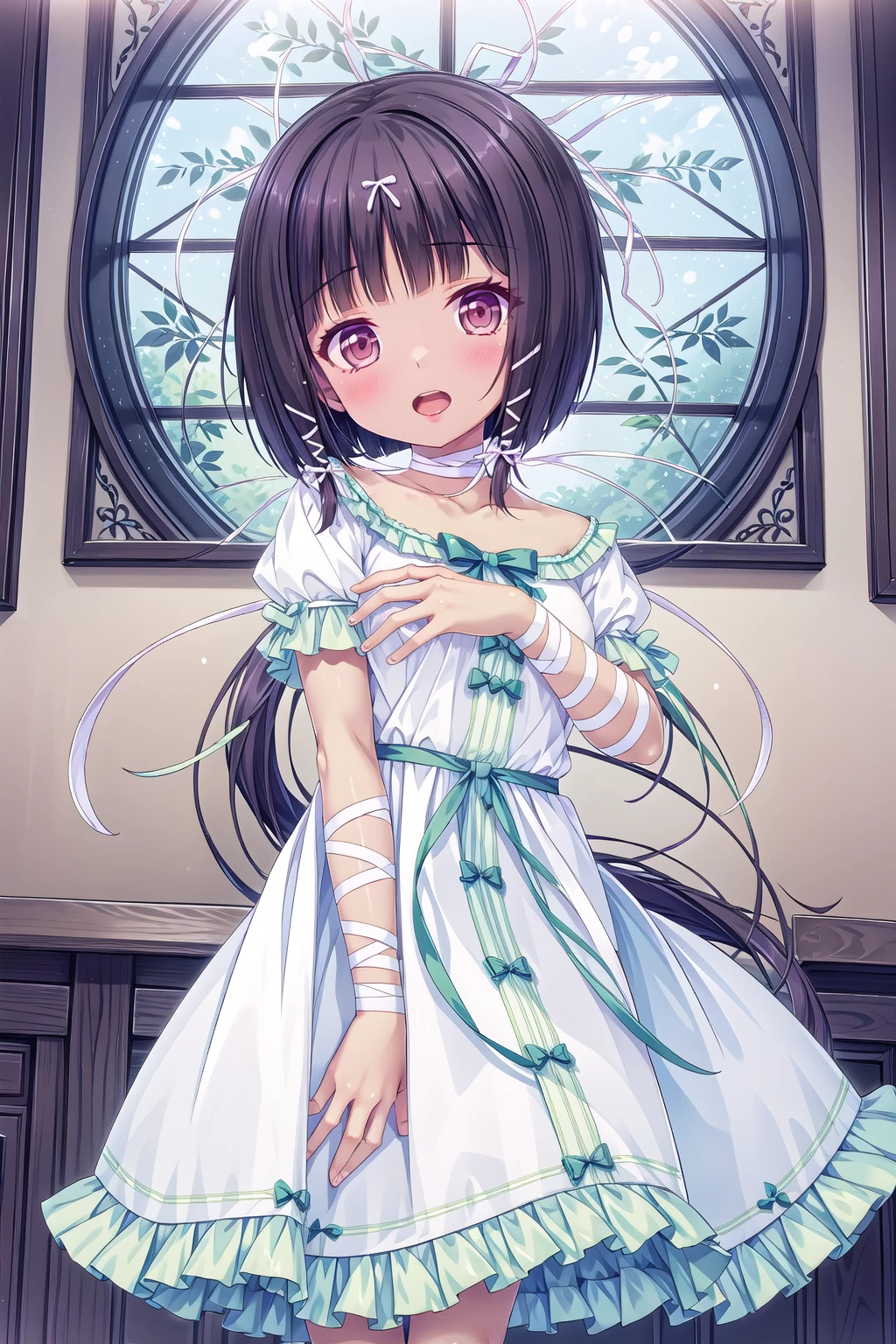 arisegawa_White_dress_Ribbon-trimmed_dress_Frilled_dress, arle, hair_ribbon, white_ribbon_choker, puffy_short_sleeves, bandages, white_ribbon, arm_ribbon, leg_ribbon, ankle_lace-up, sandals, cross-laced_footwear