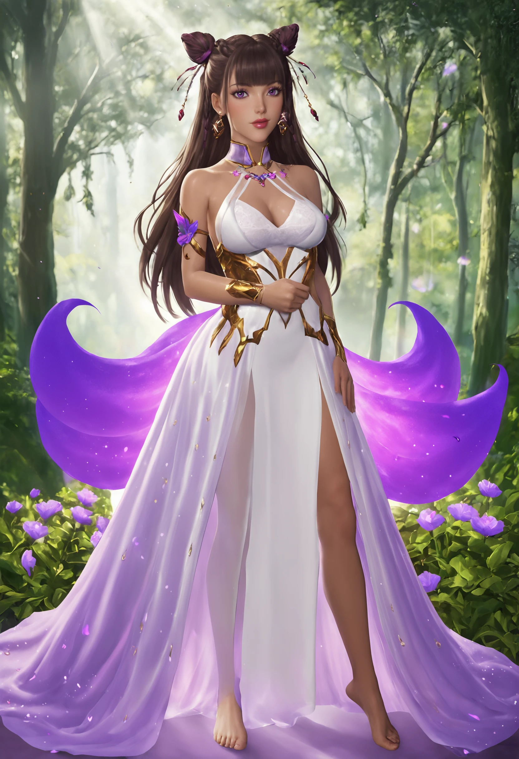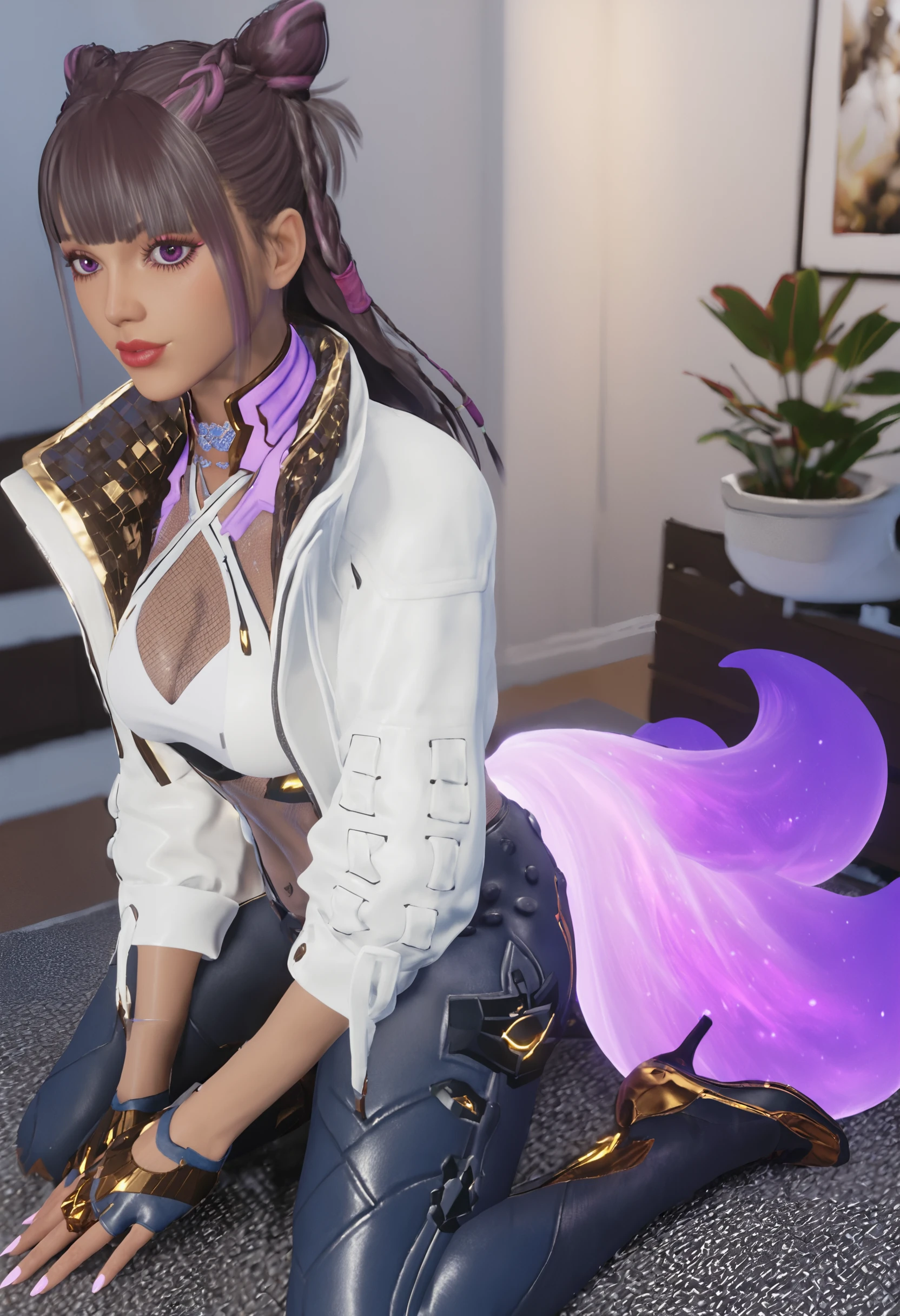 dark skin, brown hair, long hair, bangs, hair bun, double bun, hair tie, braid, eyeliner, purple eyes, lipstick, white jacket, cropped jacket, long sleeves, cleavage, suspenders, jewelry, grey pants, thigh gap, fingerless gloves, nail polish, fox tail, multiple tails, purple tails