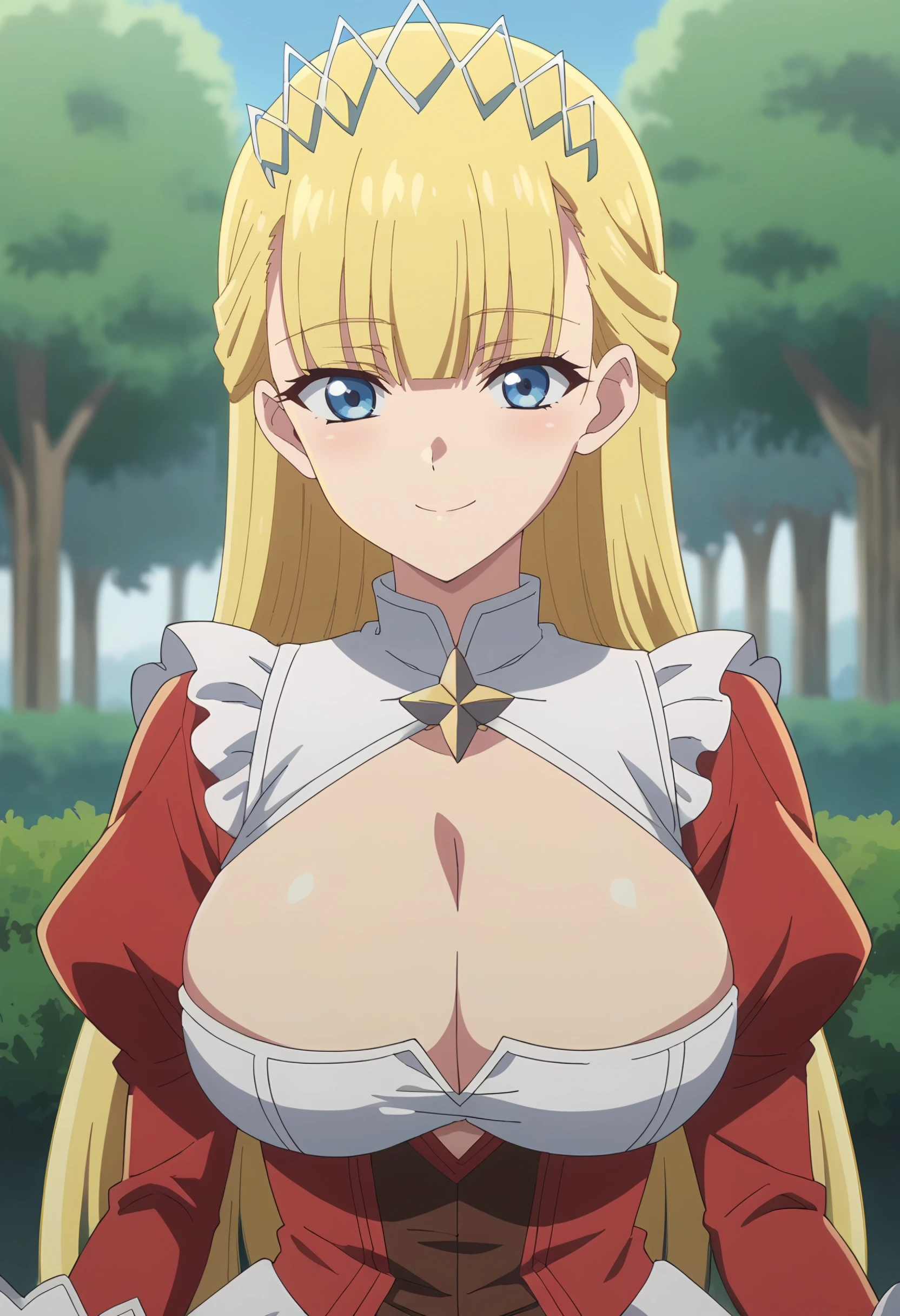 outfit 1: red dress, juliet sleeves, frills, clothing cutout,white breastwear, cleavage