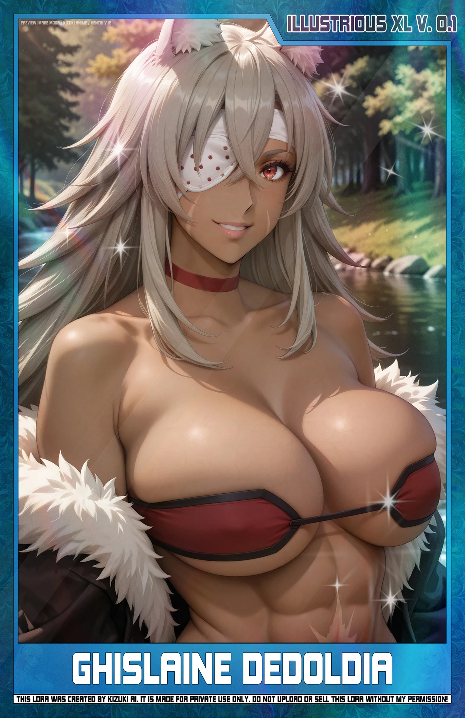 Character: ghislaine dedoldia, kizukiai lora, eyepatch, red eyes, grey hair, dark skinned female, abs, scar, scar on stomach, cat tail,