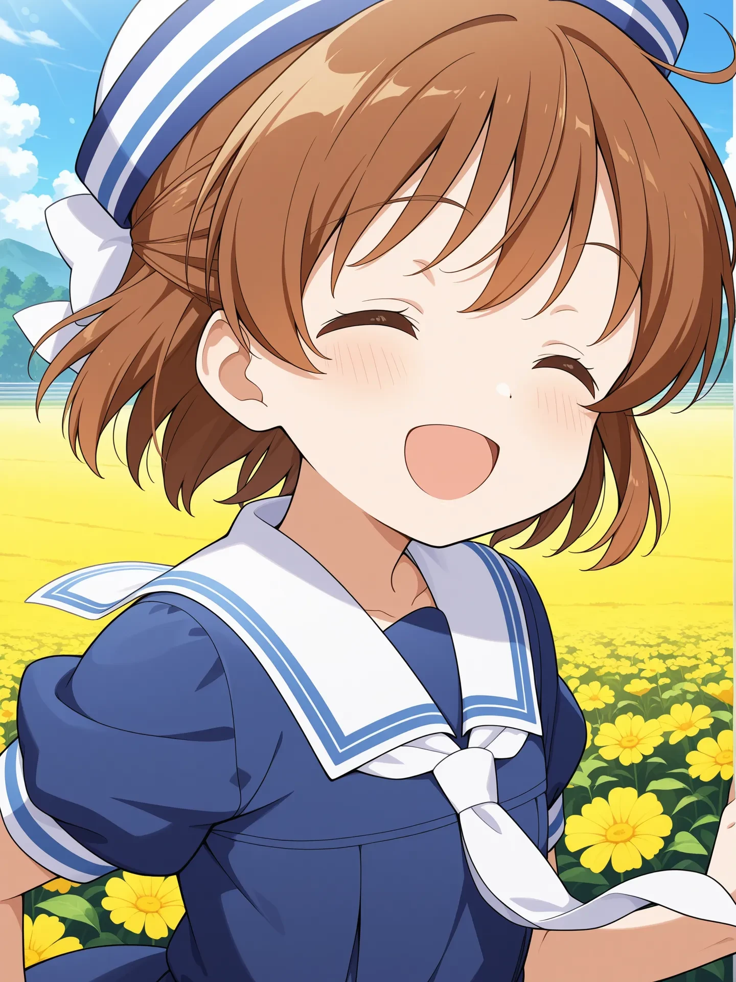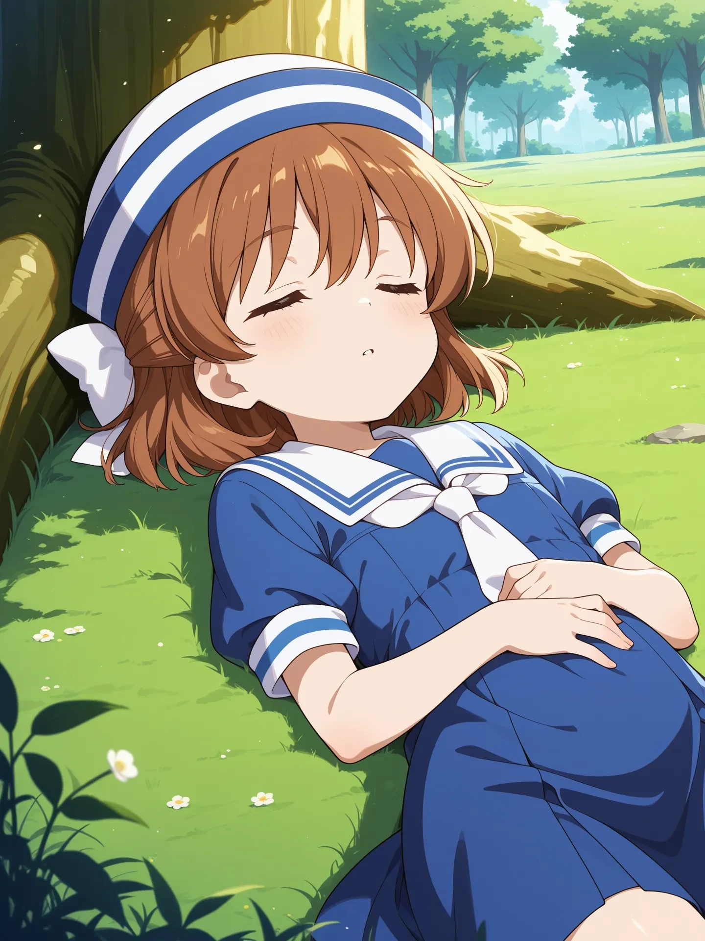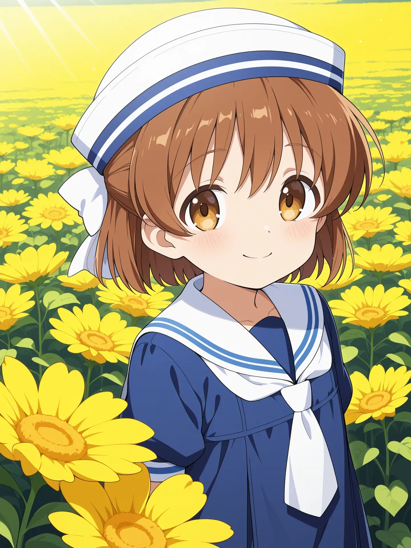 okazaki_ushio,brown hair,white sailor collar,blue sailor dress,sailor hat,white bow,white neckerchief,flat chest,short hair