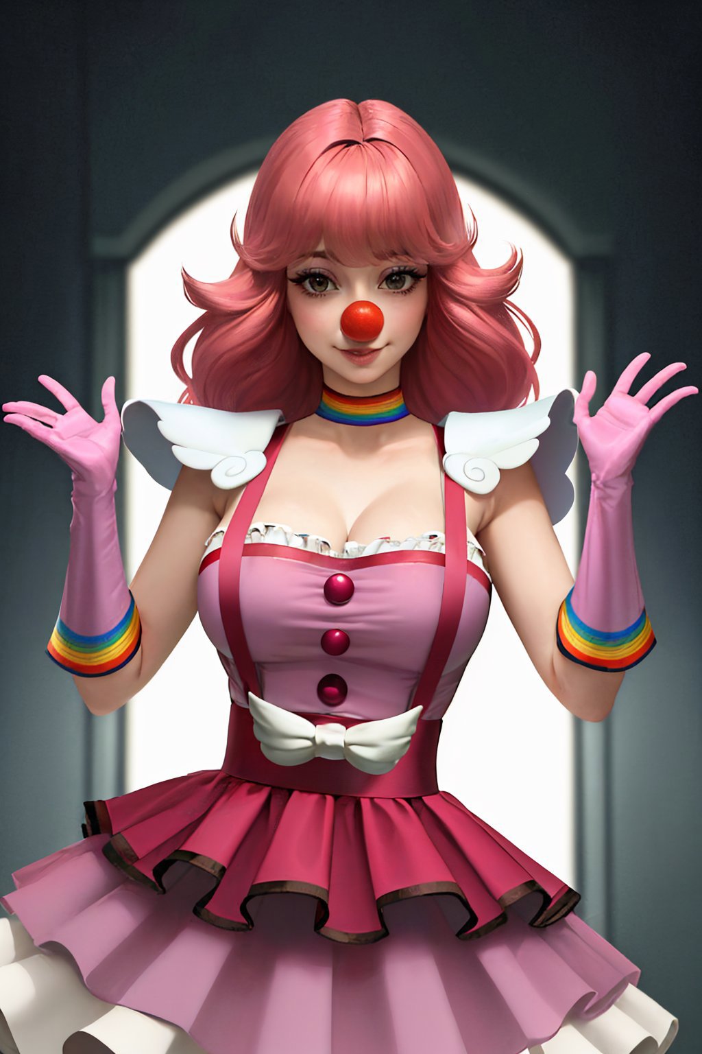 Default Outfit: clown, multicolored clothes, pink dress, suspenders, pink gloves, choker, cleavage