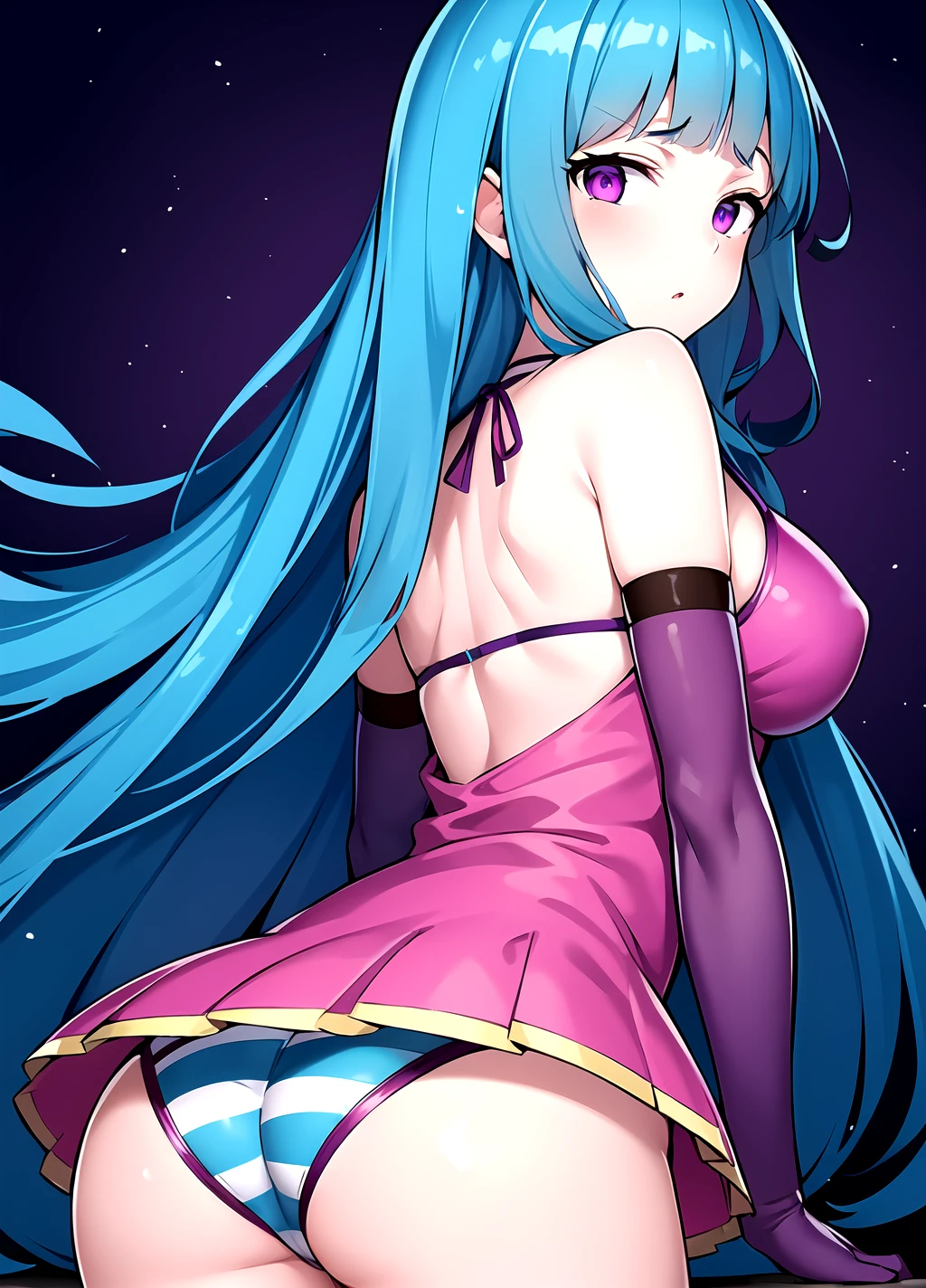 first outfit: MEMEME, long hair, dress, breasts, pink dress, purple eyes, very long hair, blue hair, medium breasts, collarbone, detached sleeves, cleavage, sleeveless, elbow gloves, sleeveless dress, gloves, purple thighhighs, blue panties, striped panties,