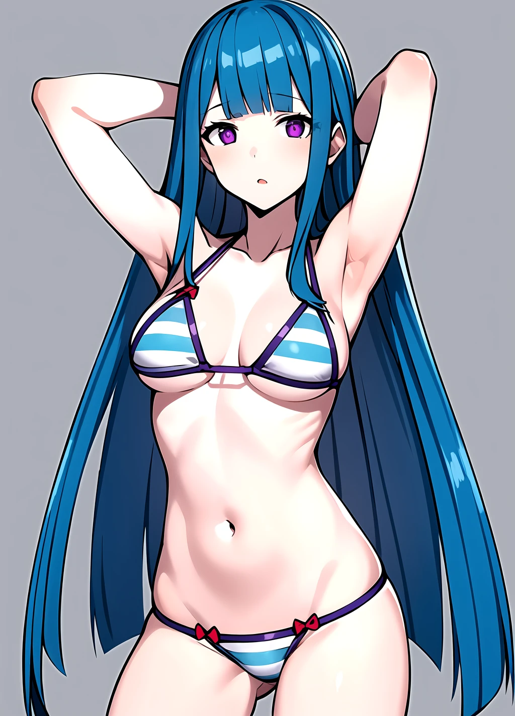 second outfit: MEMEME, 1girl, solo, swimsuit, bikini, long hair, purple eyes, striped bikini, breasts, striped, navel, very long hair, medium breasts, groin, blue hair