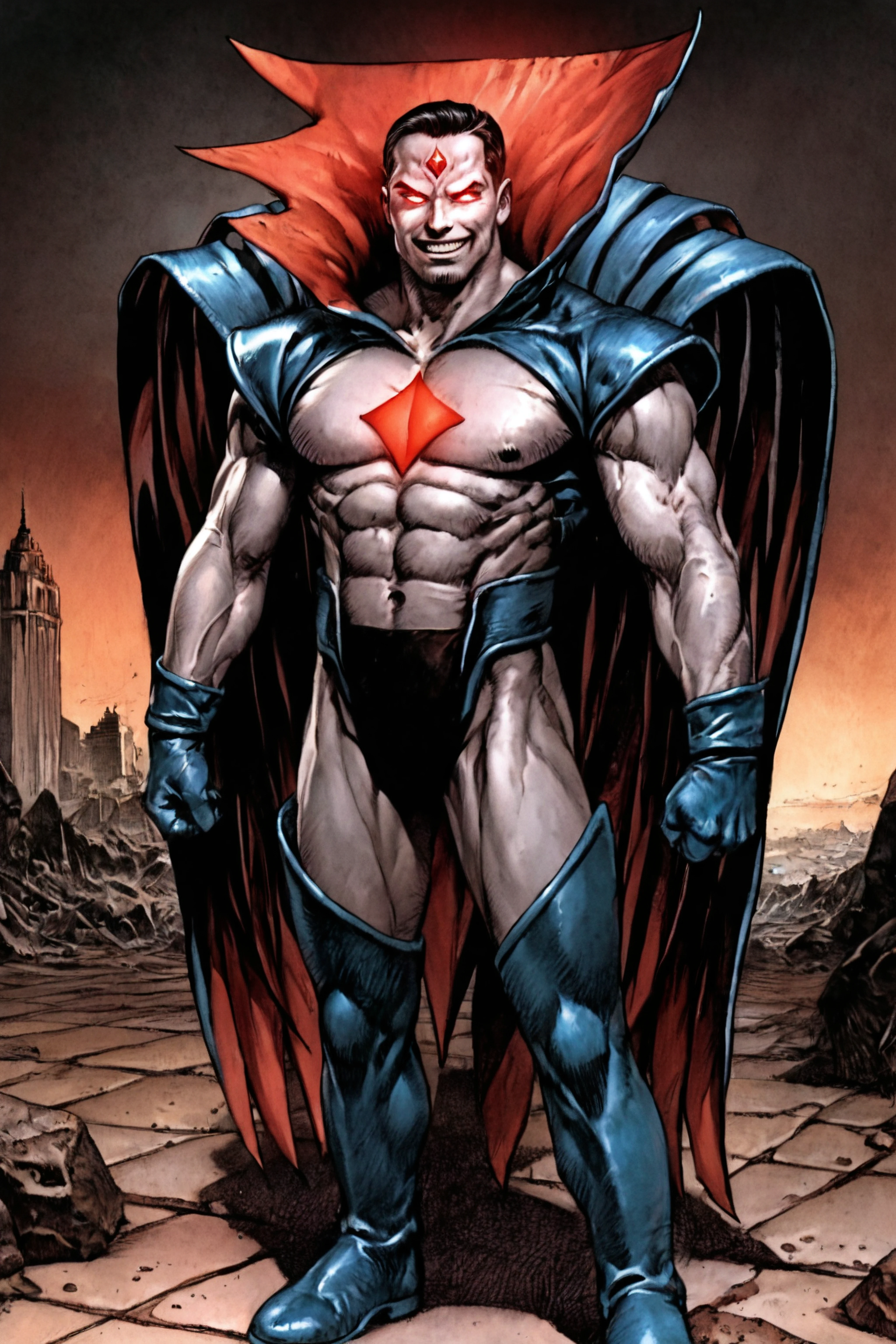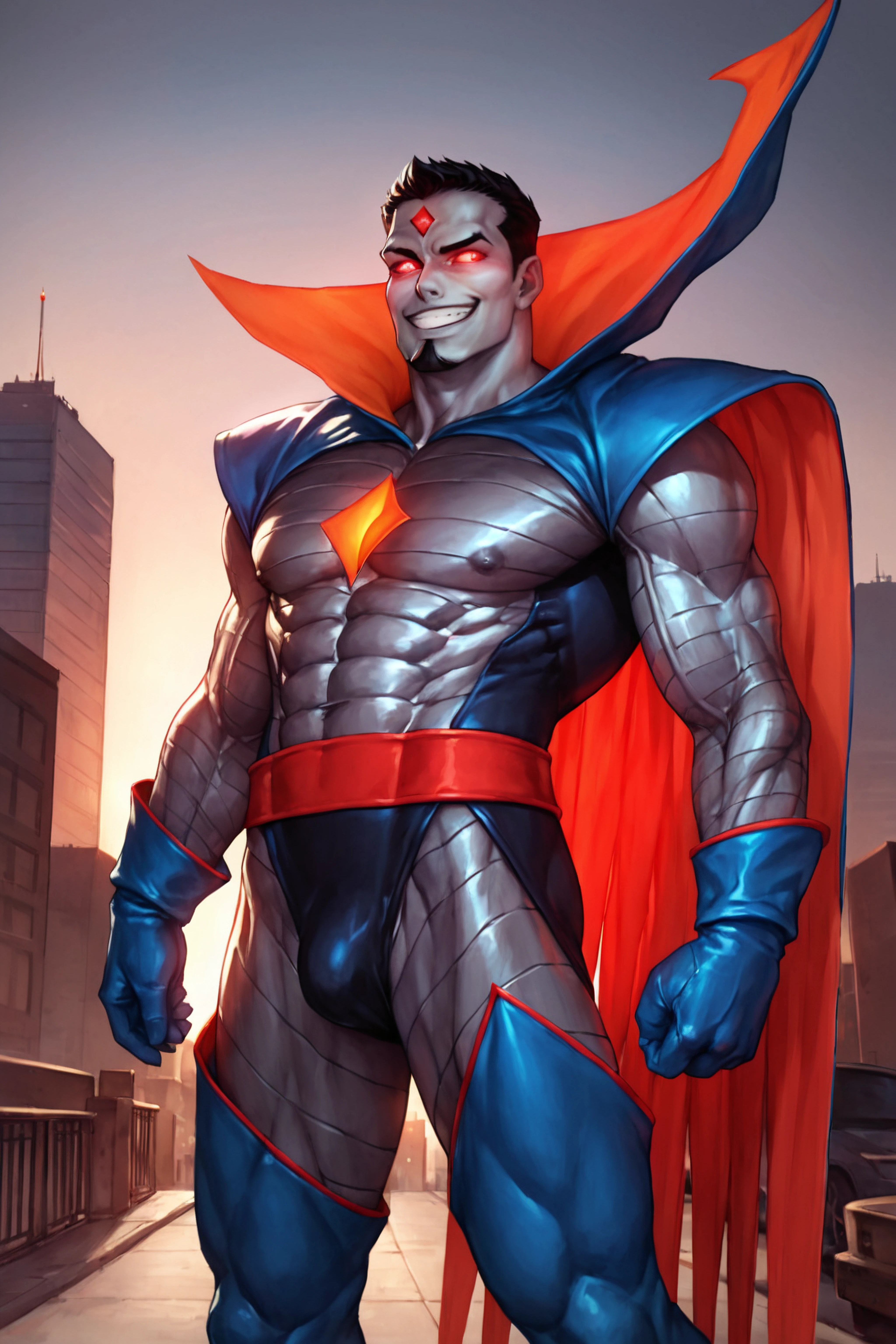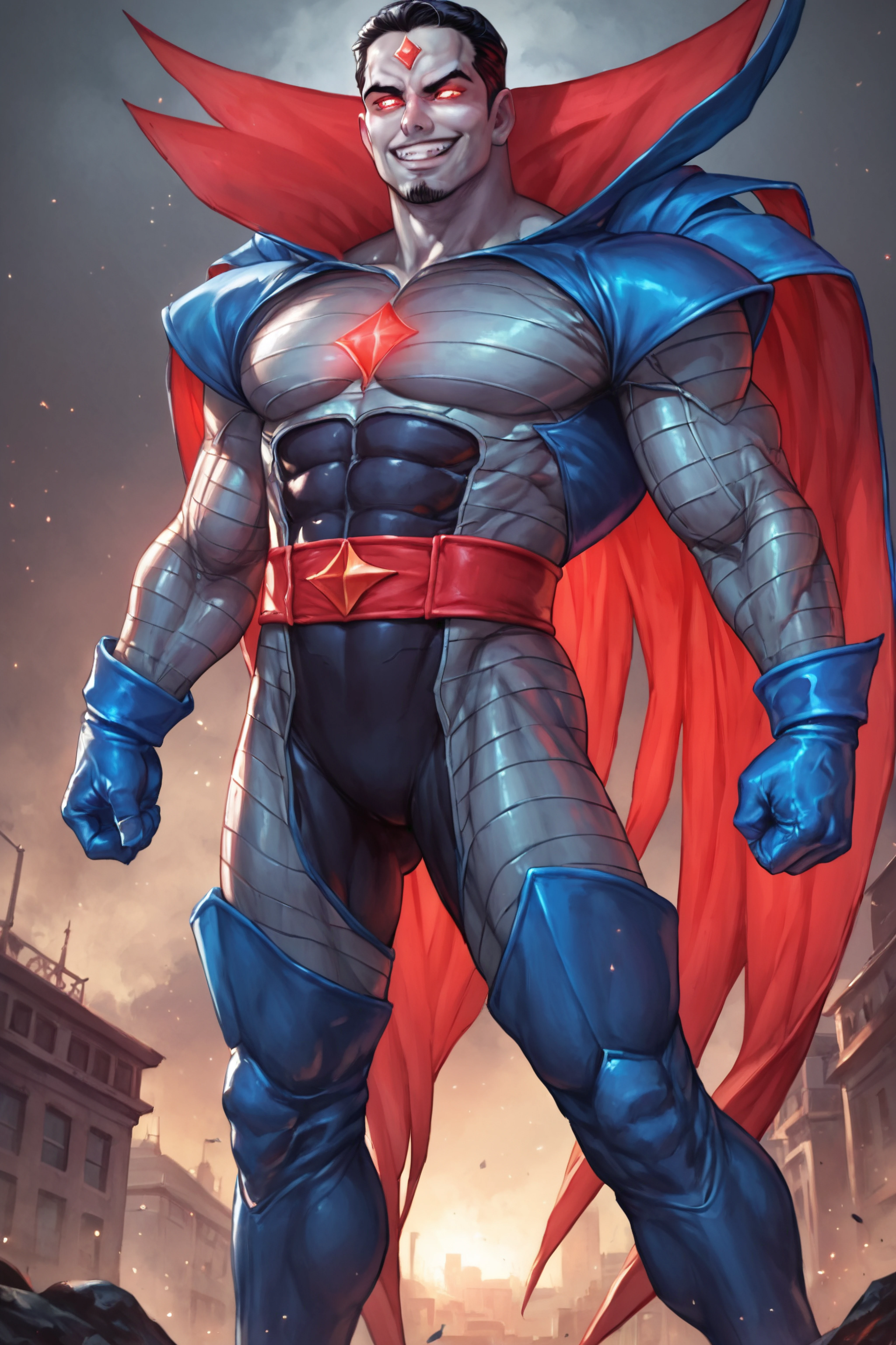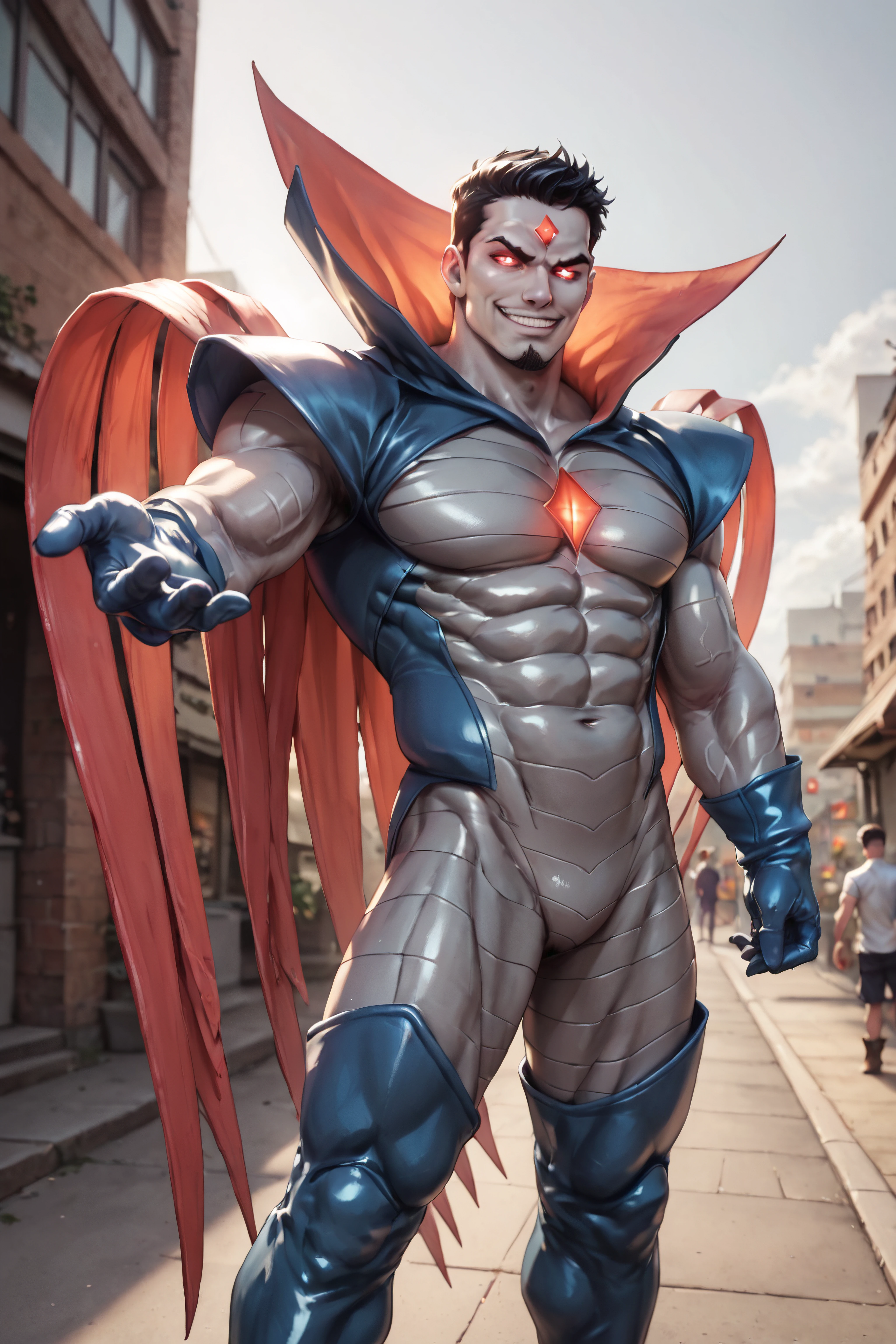 Positive Triggerwords: 1boy, red eyes, cape, black hair, superhero, facial hair, muscular, armor, smile, gloves, bodysuit, boots, forehead jewel, grey skin, glowing, glowing eyes, colored skin