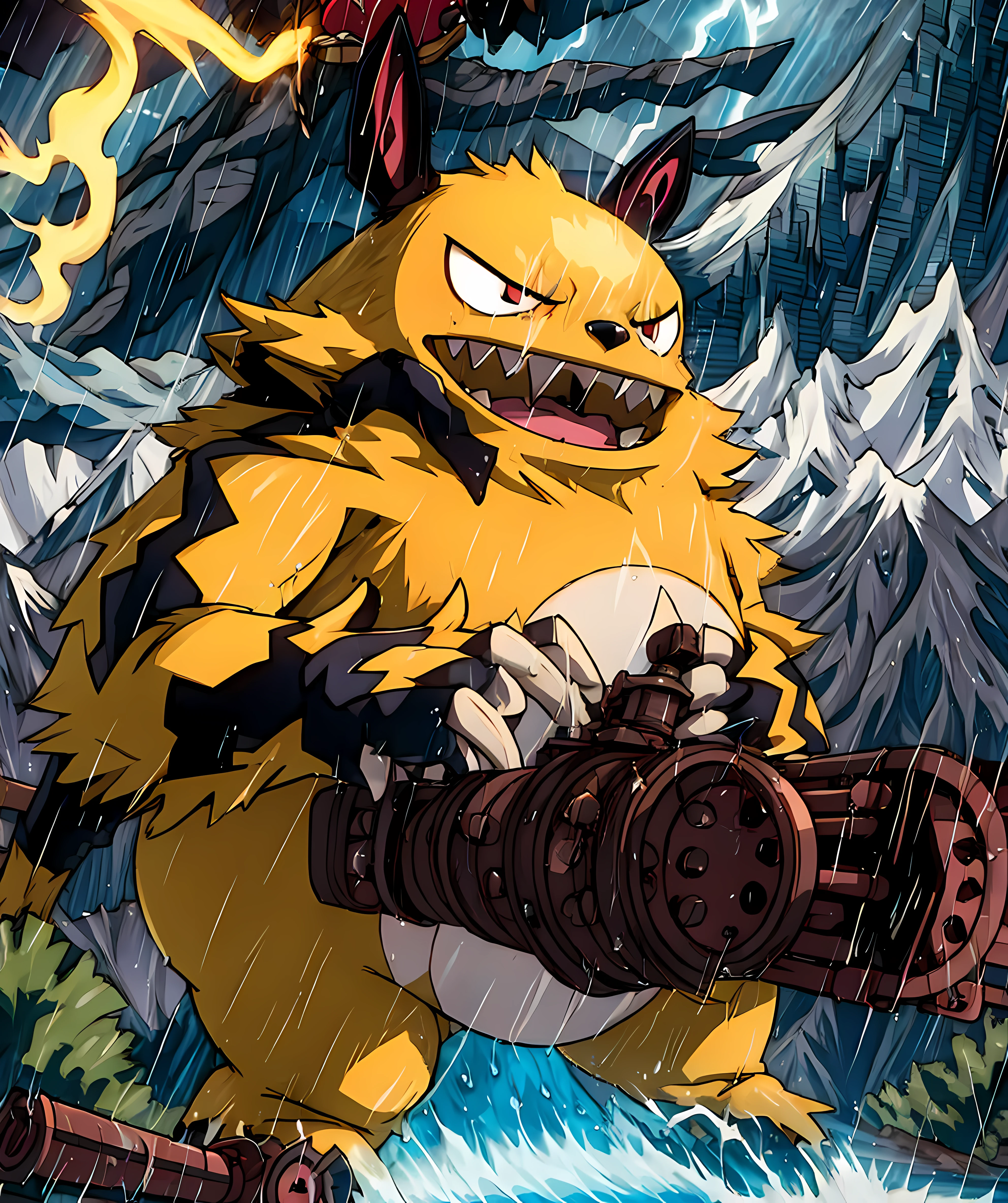 I made Grizzbolt LoRA from Palworld. For thos you don't know, Grizzbolt is a creature or Pal that came from Palworld. The design of Grizzbolt is a fusion of Totoro from My Neighbor Totoro, Electabuzz and Electivire from Pokemon. He basically front page of Palworld image that carrying gatlin gun.