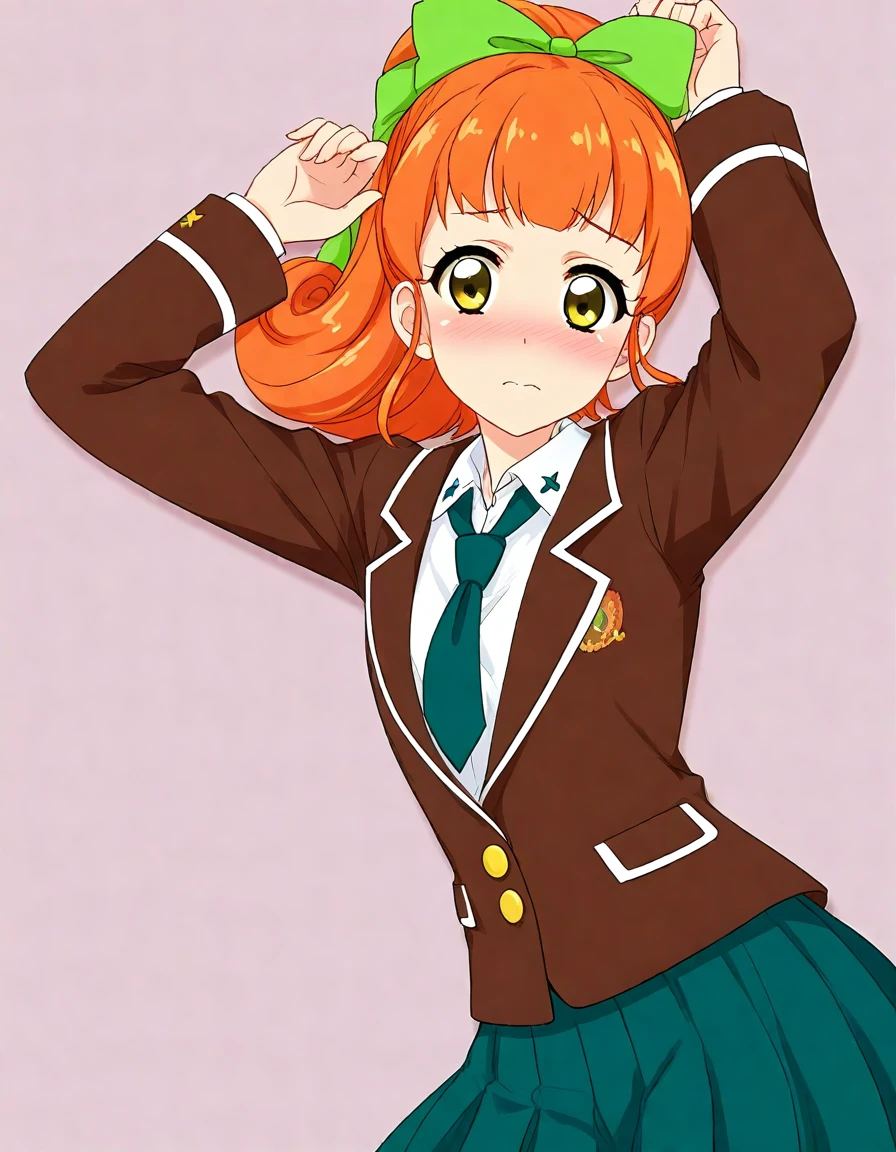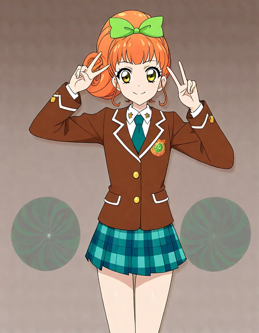 ,school uniform,brown blazer, long sleeves,green pleated skirt,