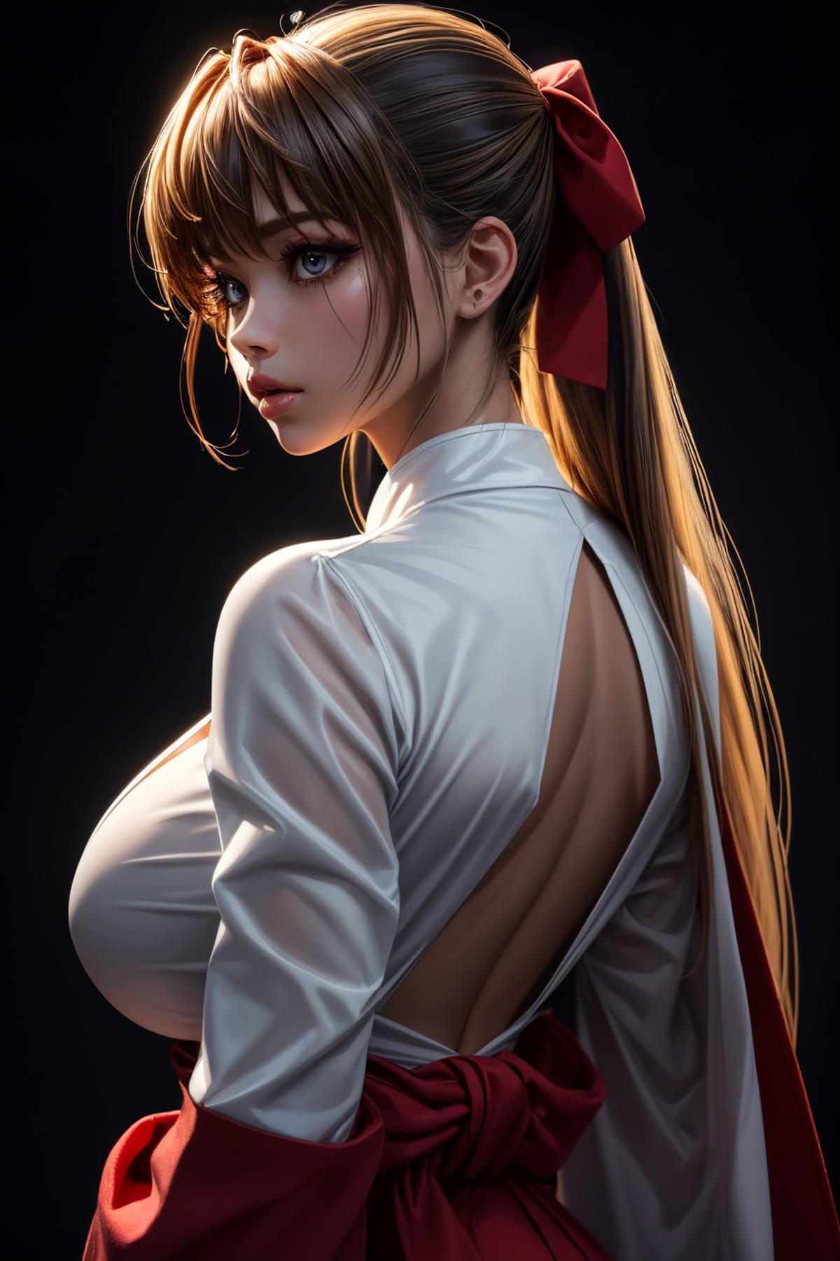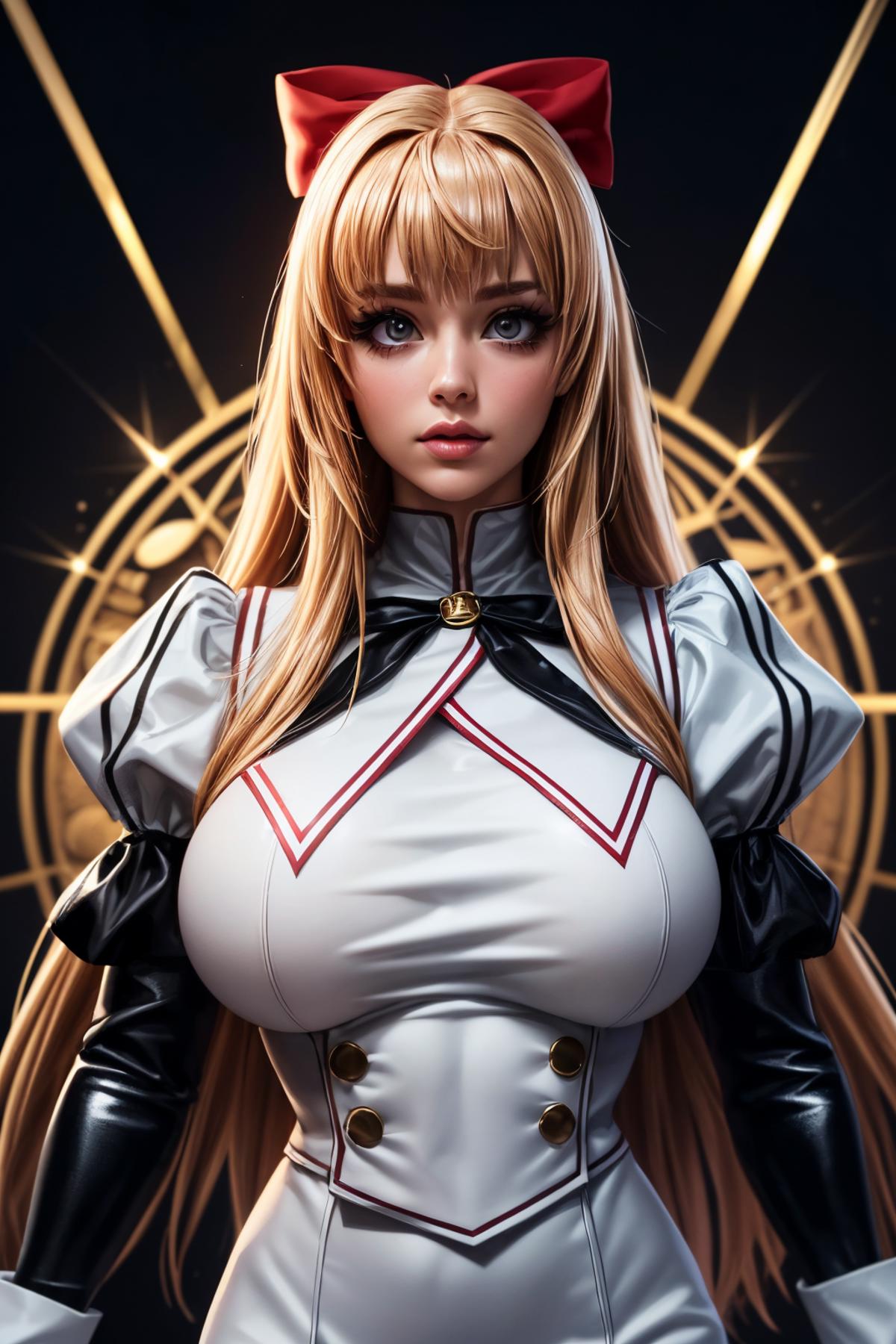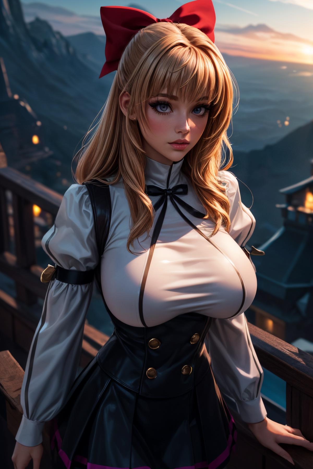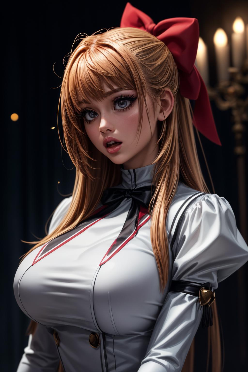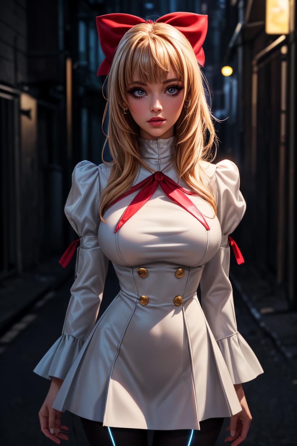 red hair bow, half updo, red school uniform, white juliet sleeves, black pantyhose, boots