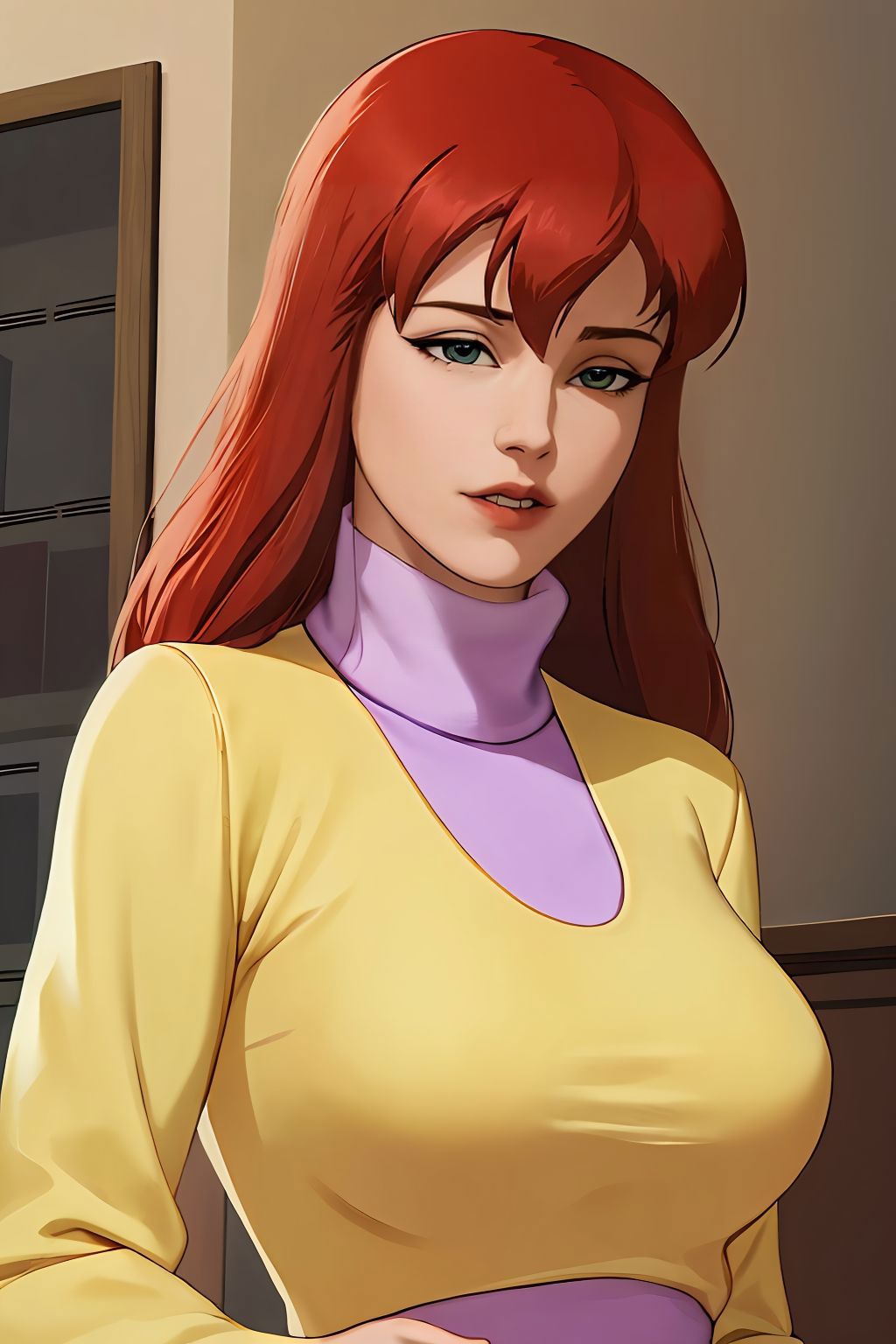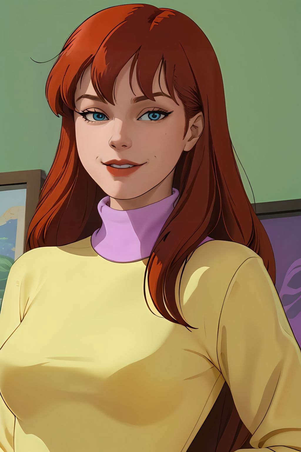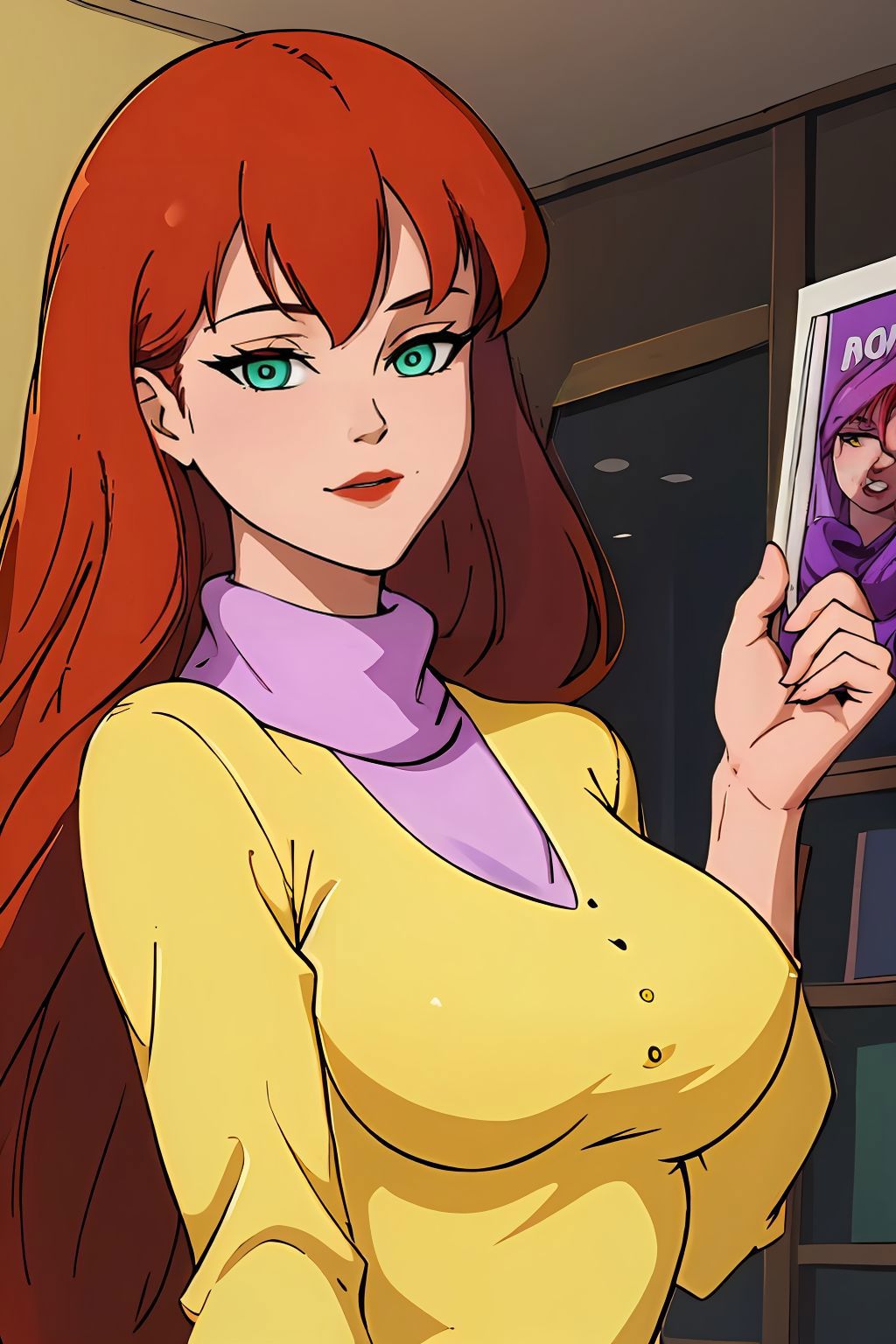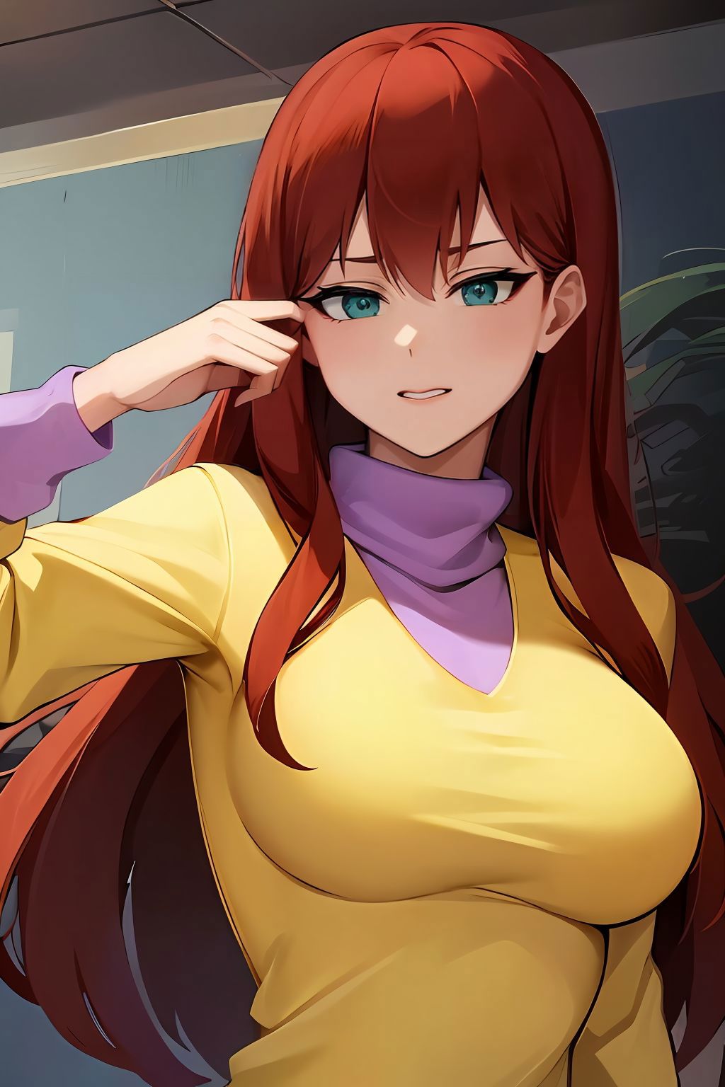 yellow sweater with purple turtleneck