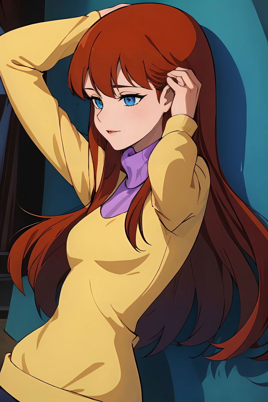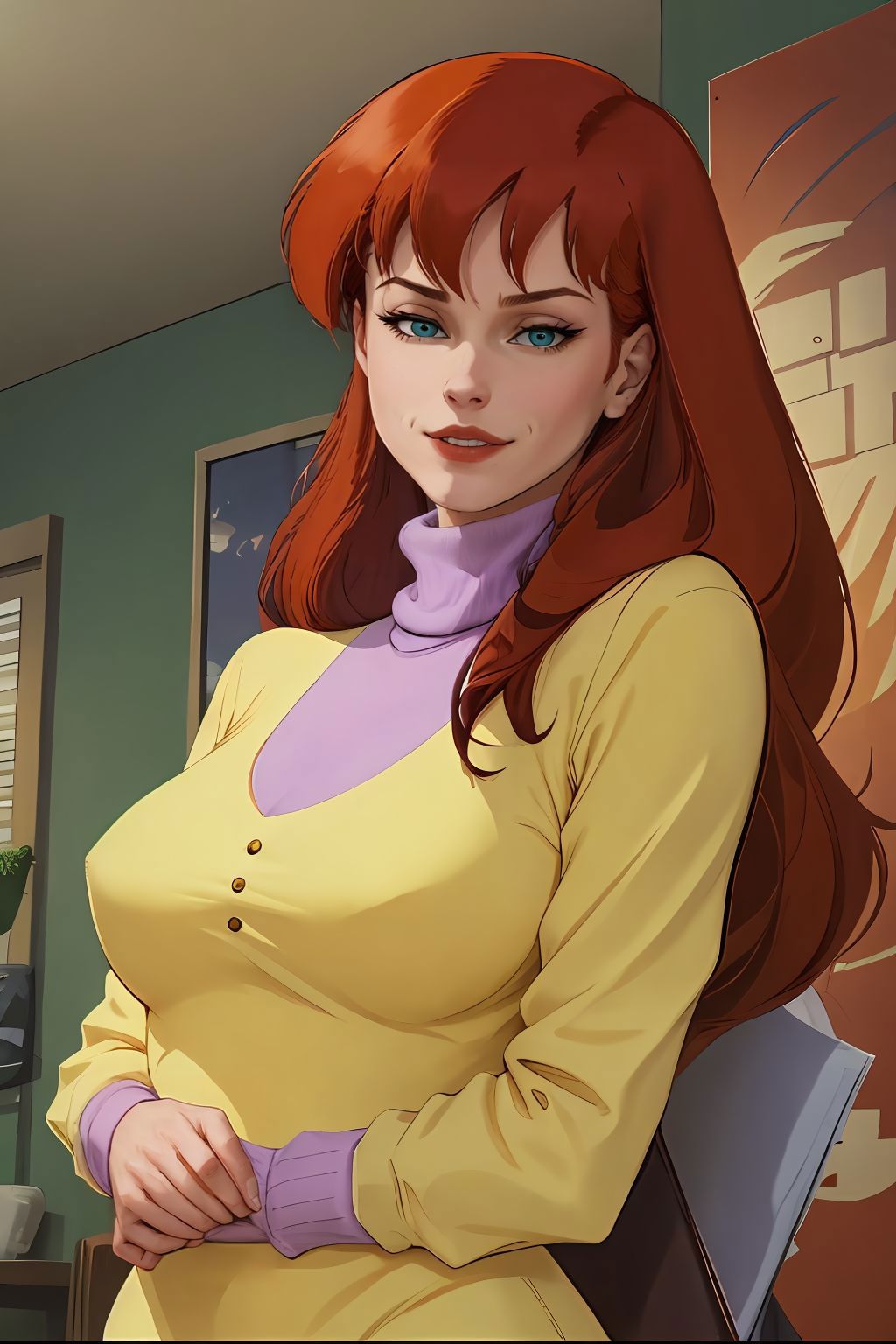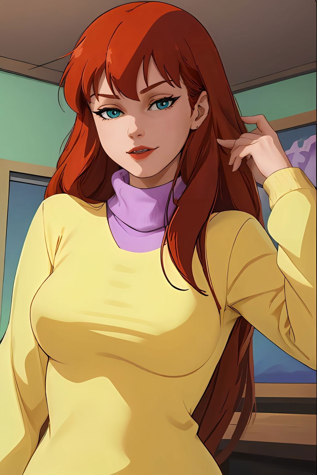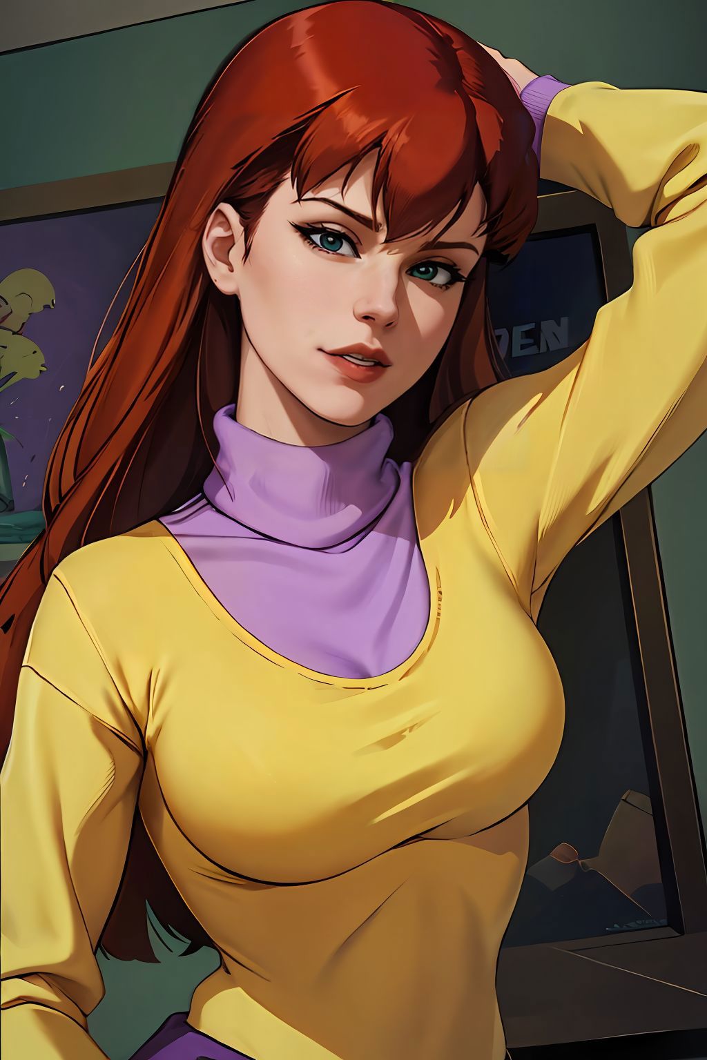 yellow sweater with purple turtleneck